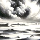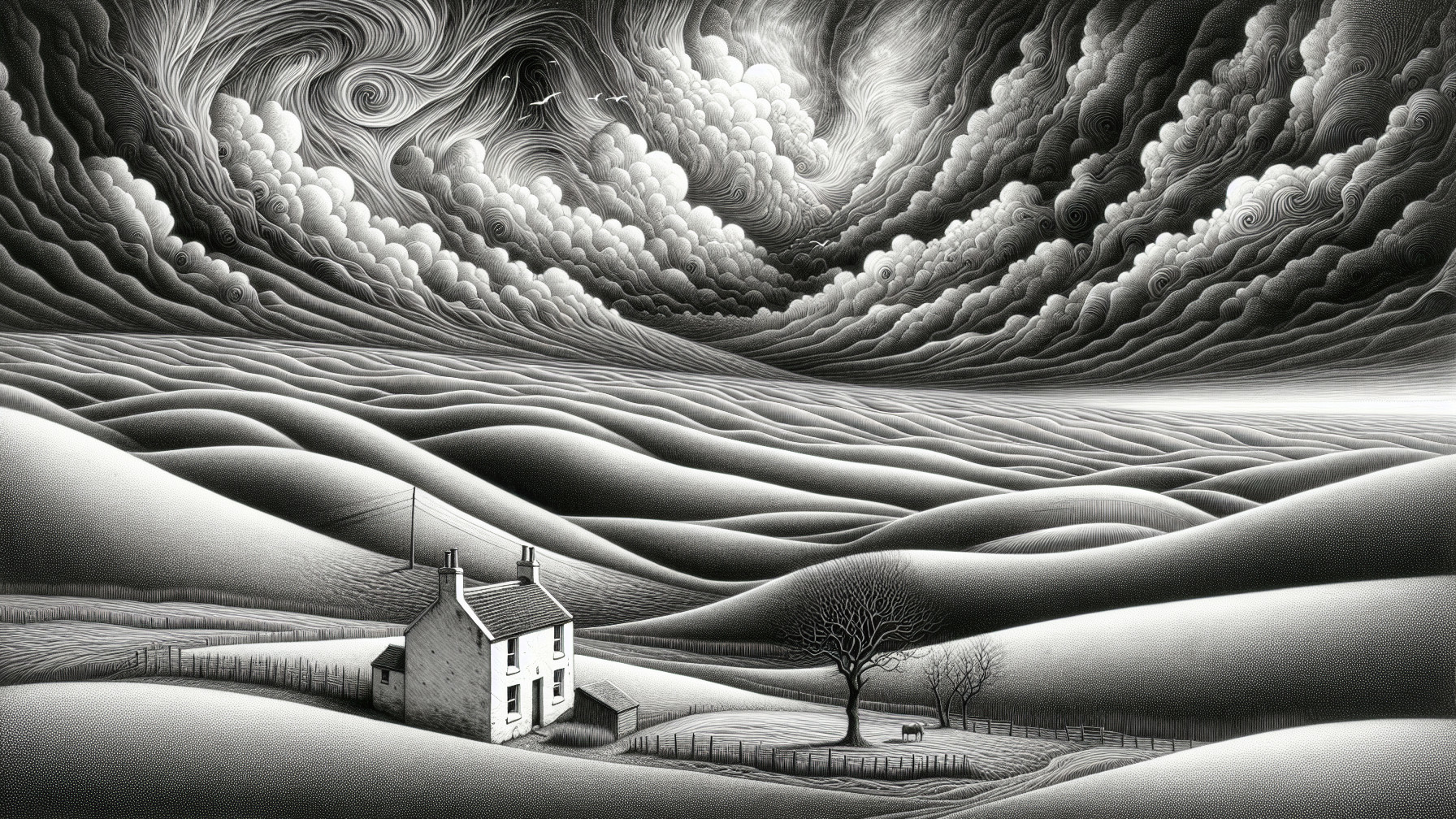 A serene black-and-white landscape featuring a quaint farmhouse, rolling hills, and a large tree. The foreground showcases furrowed fields, while a wooden fence adds rustic charm.