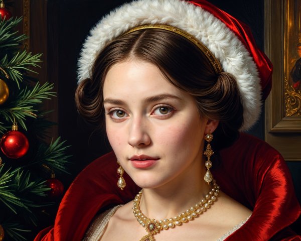 A young woman with flowing brown hair gazes softly, adorned with jeweled accessories. She exudes an ethereal beauty, set against a night sky illuminated by a full moon and twinkling stars.