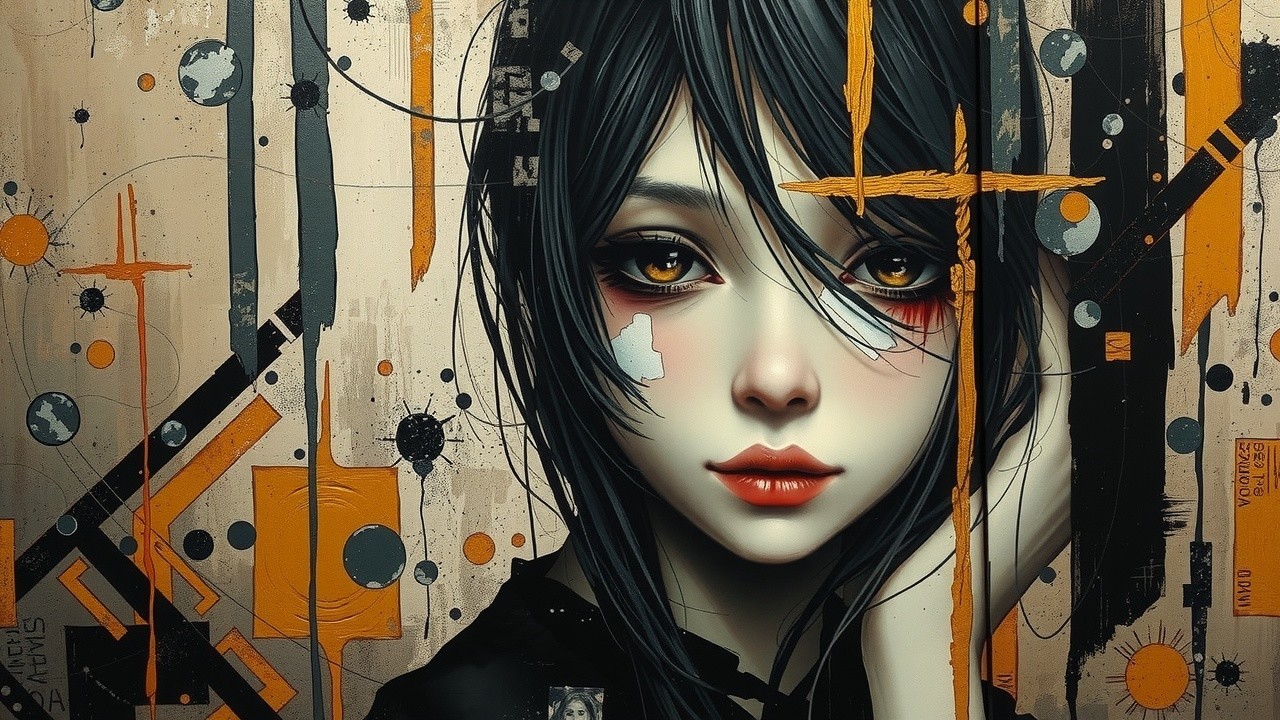 Anime Style artwork by Yukinobu Tatsu: Enigmatic young maiden with an introspective gaze, lost in thought, set against a distressed, industrial background with vertical streaks and metallic accents, reminiscent of a worn, urban landscape. The oil painting, inspired by the expressive brushstrokes of Pino Daeni, blended with the dark, mystical undertones of Zdislaw Beksinski and the fantastical, symbolic elements of Luis Royo. Ink and oil on canvas, with intertwined features, layered textures, and fragmented elements, evoke a sense of mystery and unease. Moody atmosphere, with a predominantly dark color palette, blending black, gold, and earthy brown tones, creates a sense of depth and contrast. German Expressionism's emotional intensity and modern abstract art's experimentation, merged with a touch of surrealism, result in a dreamlike, thought-provoking portrait, where the subject's thoughts and emotions seem to blur and blend with the surrounding environment.