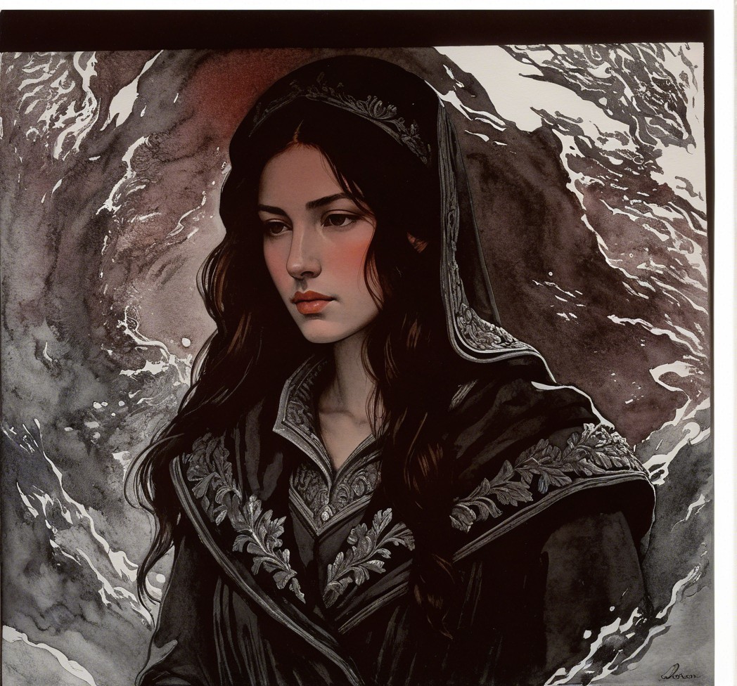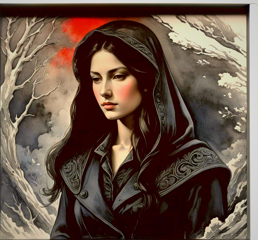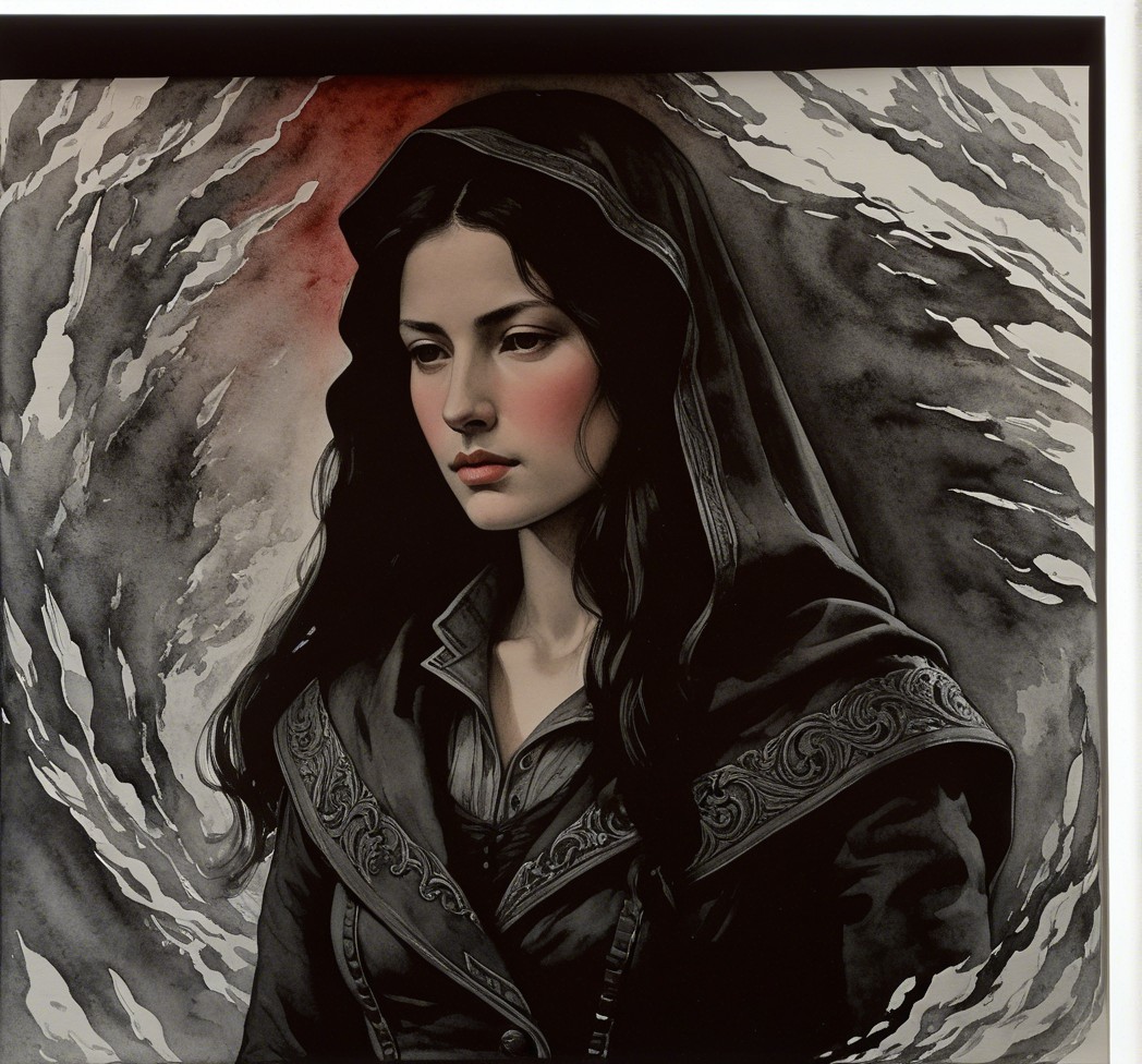 watercolor and ink by Gustave Doré, Sfumato, bokeh, debeh,reminiscent of pen and ink, saturated tones charcoal drawing, hues of ho baron and Gustav Dore.Marinism. Searching for non-obvious connections, loose cdolor shapes, overspray of ink, minimalist, serene atmosphere, stylized Woodblock print, tints of 3d linocut, upper body portrait of beautiful female mercenary, frontal view, stacked lines,precise gelsculpt 64k, book cover art, tints of marvel comic book art, dreamy, soft edges, intricate lineage by ho baron,plasticity 1.3, raytraced shadows 1.2, magical realism, dark umbra,, Boulet's surreal elements, Jackson Pollock's abstract flair. details, reflections, parallax occlusion 1.5, great depth and scale, opalescent,sculpted, perfect handsface, cel-shaded, tints of chibli art, layered geometrical vector art, detailed style of patrick nagel and ho baron and Margaret Keane, intricate lineage, precise Gelsculpt 64K, tints of geometrical art, 3d effects 1.8, dynamic lighting, anisotropic filtering, brightness 1.4, visible textures, stylized illustration 1.8, vaporous auburn flares, stacked strokes, rule of thirds, ((chaotic background, 3d effects, radiance, brightness 1.4, spiritual essence, intricate background, detailed crackles, tints of Streamline_Moderne, stacked lines, stylized lineage, Schreger lines, Pastel colors 1.7, embossed strokes, raytraced shadows1.8, vibrant colors, high coloring 1.9, shadow mapping 1.9,rendered, xeroxed, octane render, cuteness, lavish, moody, synthetic, synthetic, Anglocore 1.9, auracore 1.7, high coloring 1.9, depth of field 1.7,bokeh, debeh, precise gelsculpt 64k, blotting, cel-shaded, tessselated,pen and ink details, tall and lean features