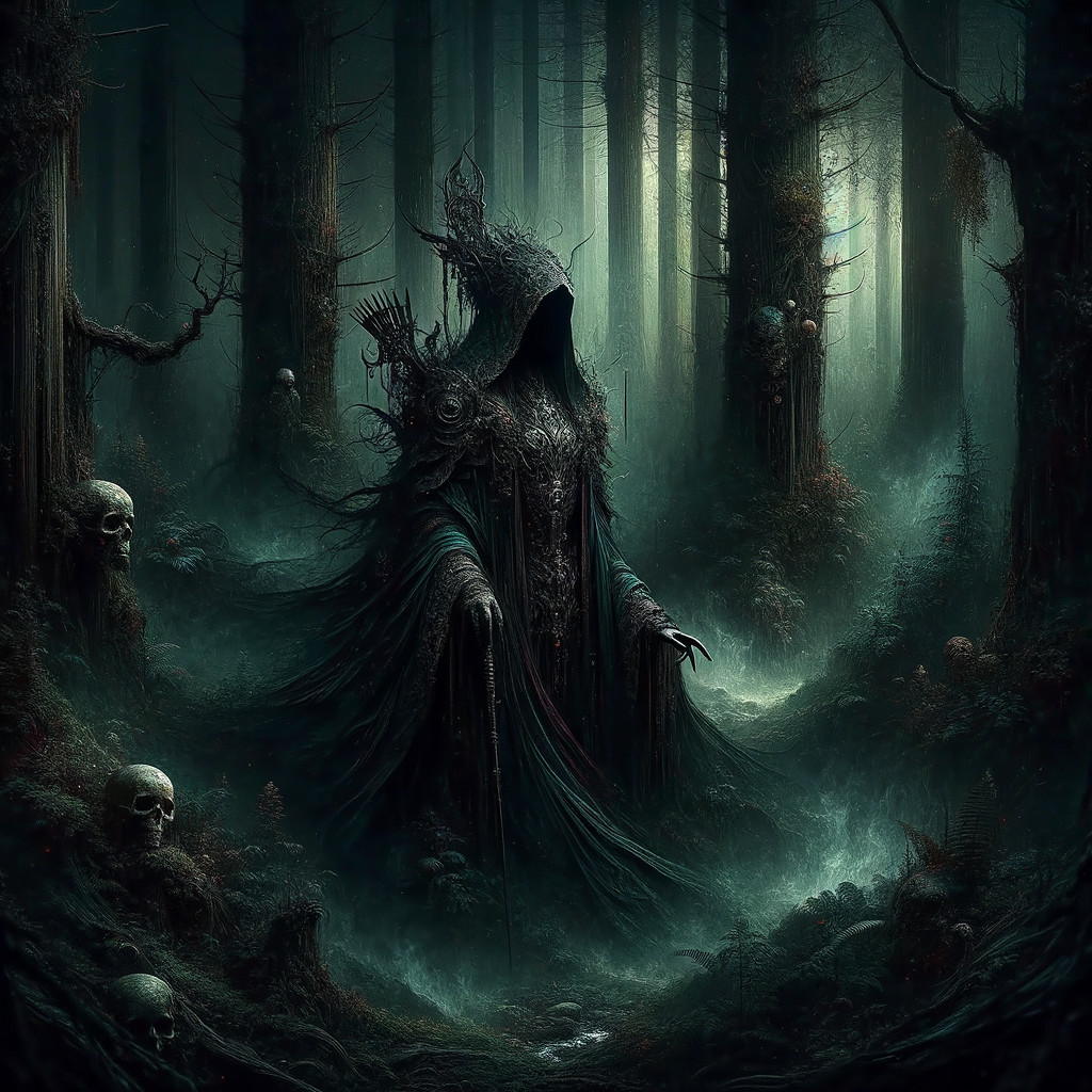 Prompt: "mysterious figure standing amidst a dense forest, shrouded in shadows; dark and atmospheric, concept art, surreal, haunting, intricate details, deep color palette, dramatic lighting, ethereal atmosphere, elusive presence, enigmatic, captivating, fantasy art, mystical, highly detailed, elaborate costume, atmospheric perspective, by H.R. Giger, Zdzisław Beksiński, Brom, dark fantasy, gothic, macabre, otherworldly, trending on DeviantArt, hidden secrets, hauntingly beautiful, enigmatic expression, mysterious aura, enshrouded in mist, atmospheric perspective, digital painting, intense gaze, hauntingly elegant, by Greg Rutkowski, dark and brooding, intricate patterns, mesmerizing, eerie ambiance, secret knowledge, enigmatic symbols, unsettling, enigmatic narrative, masterful composition, hauntingly alluring."