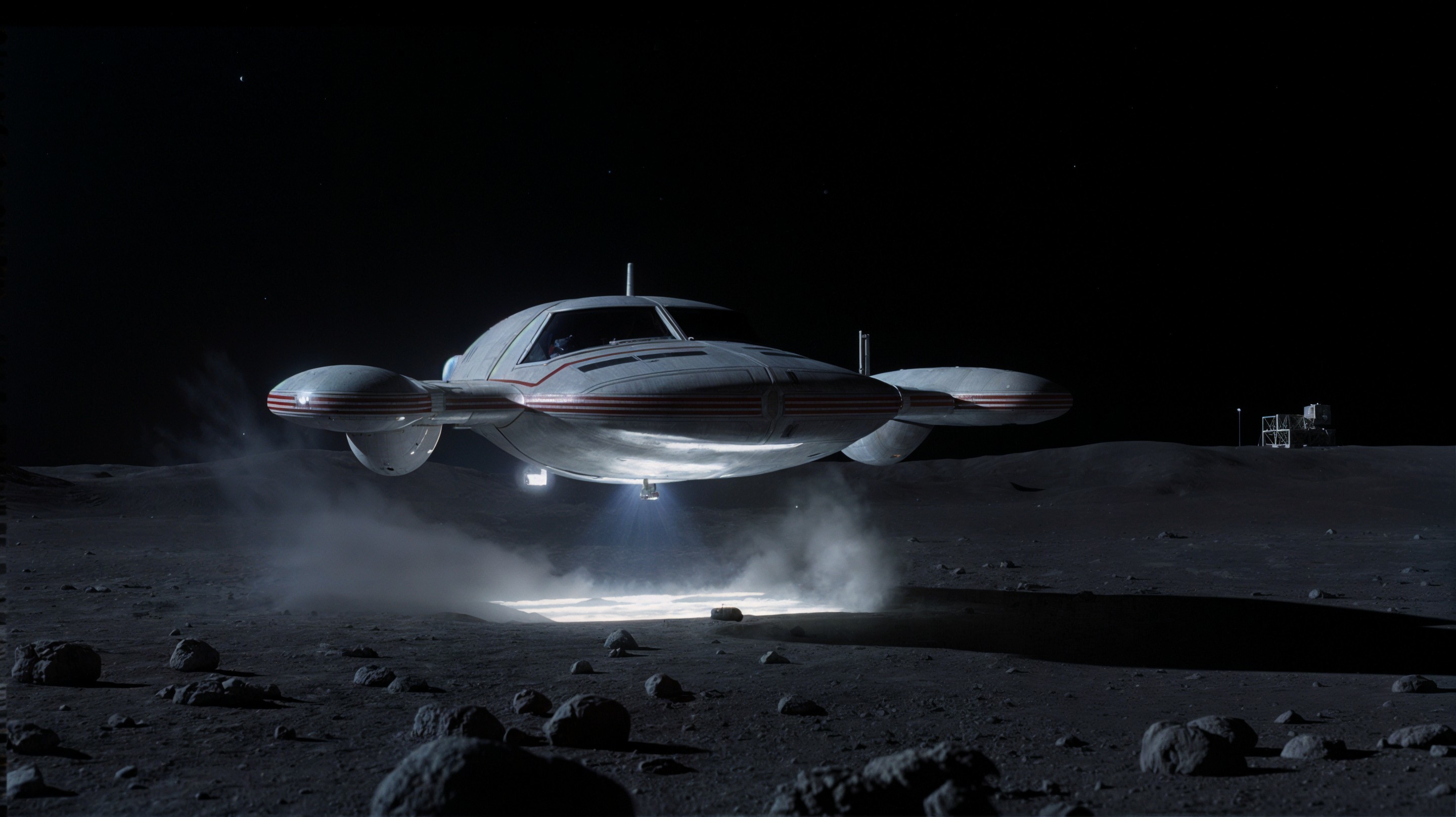 A sleek spacecraft hovers above the rugged lunar surface, emitting a trail of dust. In the background, a lunar module stands against a starry sky, highlighting the tranquility of space exploration.