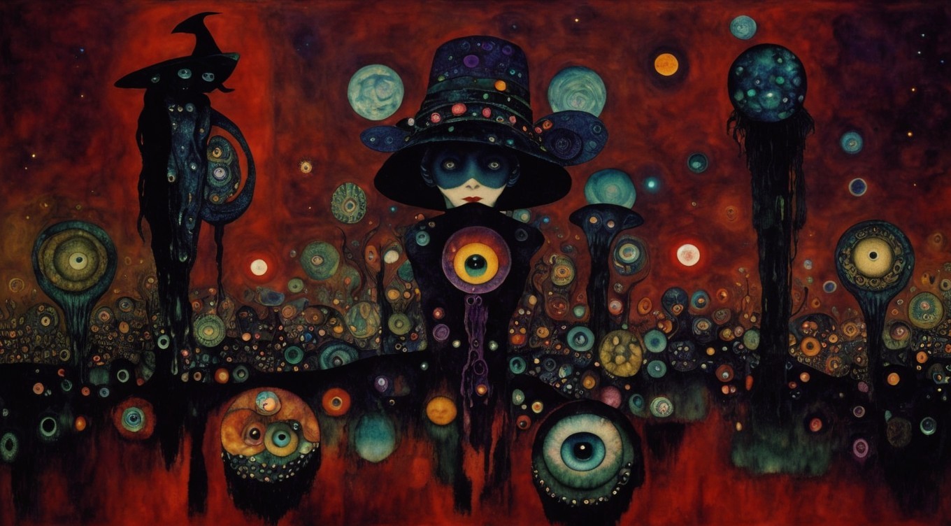 + Prompt:very creepy scene, beautiful witch with large black hat and leather strapped boots, blue textured fleshy octopus-monster with large eyes, orb-creatures that look like large eyes, scary horror, by Egon Schiele, Paul Klee mixed media, metallic inks by Gustav Klimt , background is astronomy photo like cosmic nighsky with aurora borealis