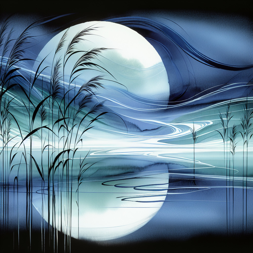 A serene landscape featuring a large, glowing moon reflected in calm waters, surrounded by soft waves and silhouette-like reeds. The color palette consists of shades of blue and white, creating a tranquil atmosphere.