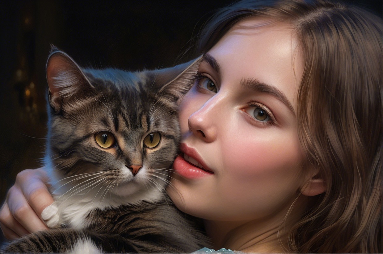 A young woman with long, wavy hair gently holds a fluffy cat close to her cheek, both looking content. Soft lighting highlights their features, creating a warm, intimate atmosphere.