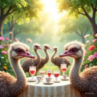 A whimsical scene featuring four ostriches enjoying tea at a beautifully set table in a vibrant garden, surrounded by colorful flowers and gentle sunlight illuminating the setting.
