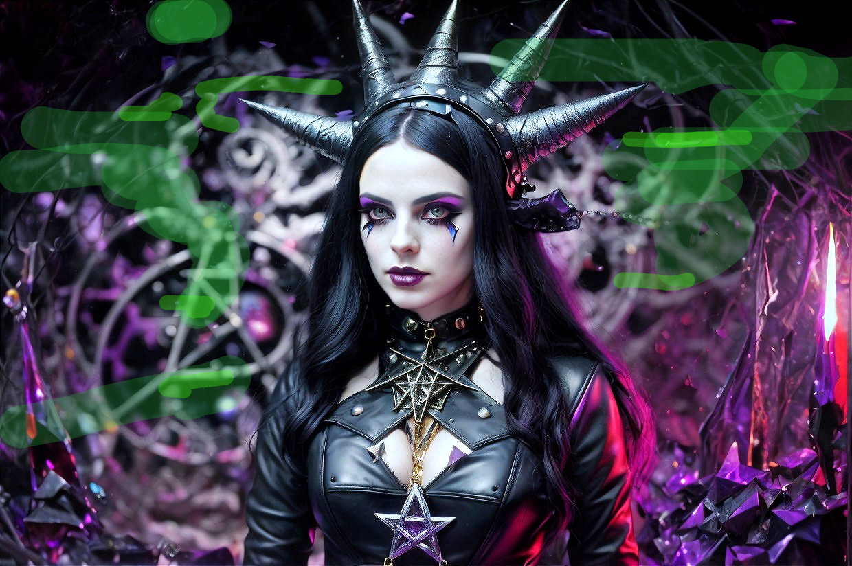 Prompt: beautiful demon witch, demonic horns, leather suit with golden brassiere, pentagram necklace, magical symbolism, bizarre photorealism scene by Richard Corben and Bill Sienkiewicz, , cosmic background,, by Egon Schiele, Paul Klee mixed media photorealistic,, depth of field, green mist, green smoke, glass shards, metallic ink details and realistic textures, beautiful ultra detailed colourful double exposure merging