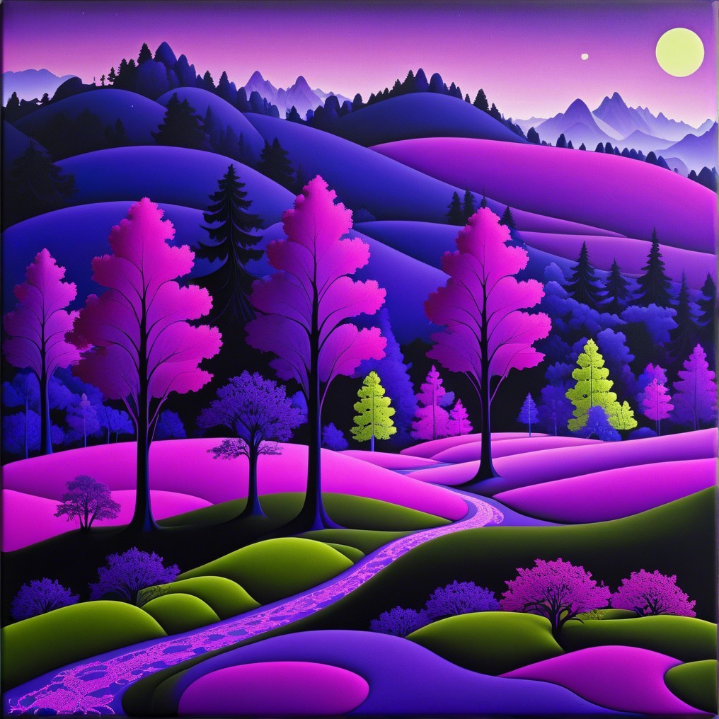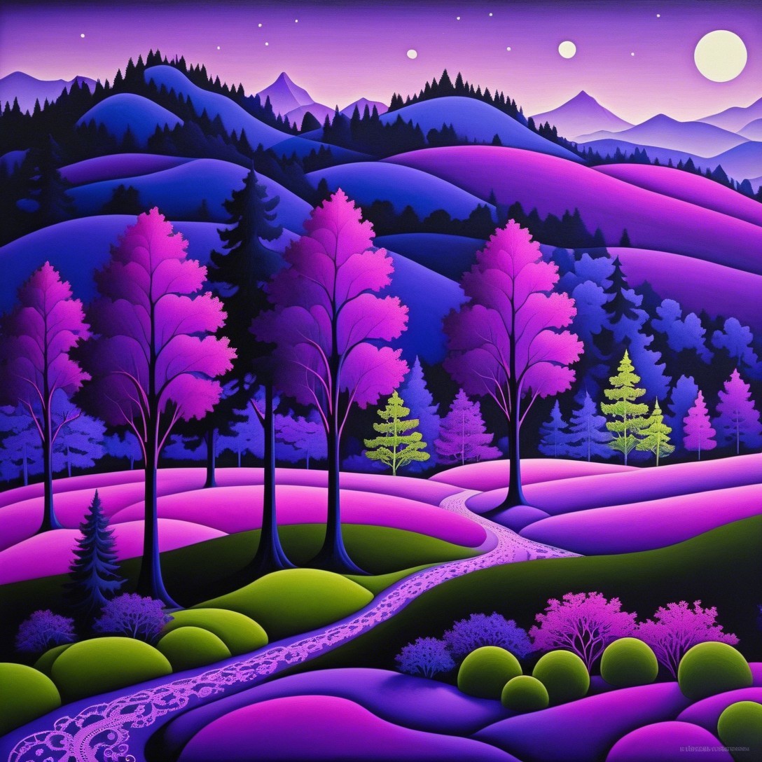 A vibrant landscape features rolling hills, purple and pink trees, and a winding stream. The sky glows in twilight hues, with a bright moon casting light over the serene, colorful scene.