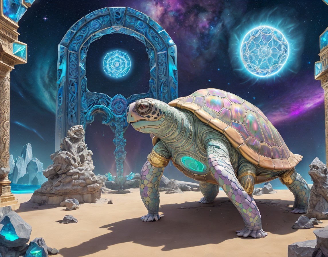 A fantastical robotic tortoise in a desert with crystalline structures, beneath an alien sky with two cosmic portals.