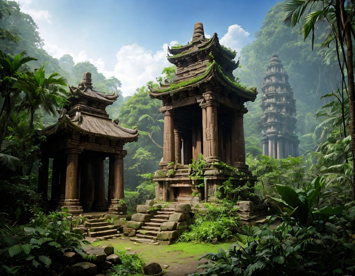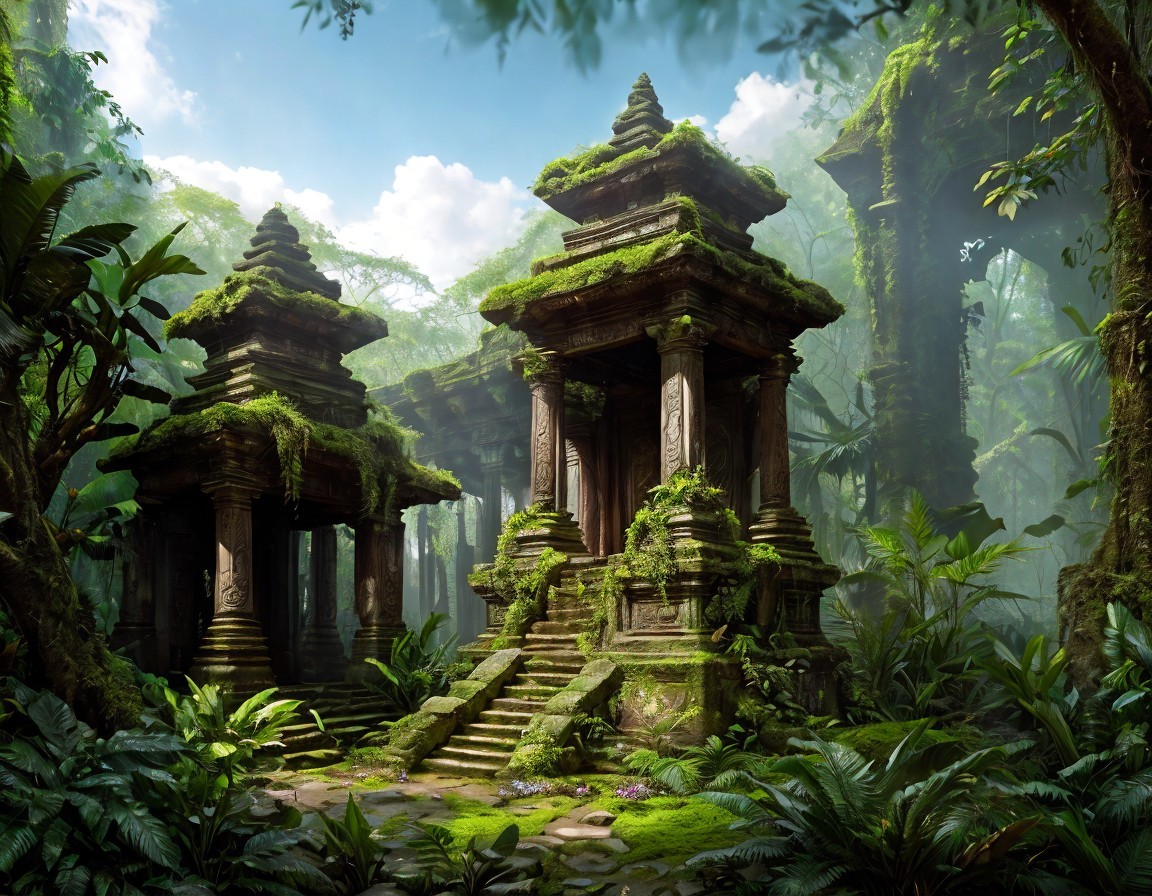 Ancient moss-covered ruins in a lush forest with sunbeams piercing through the misty canopy above.