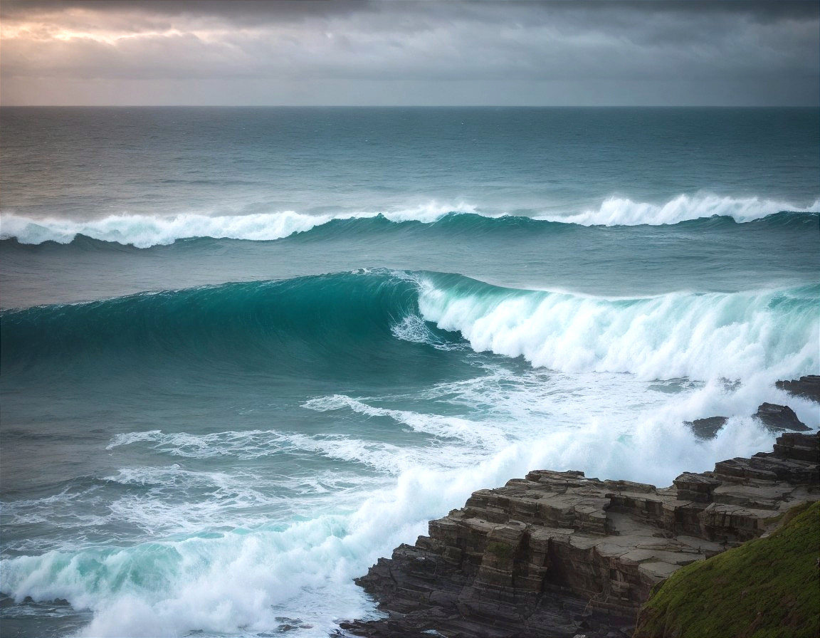 A stunning seascape featuring turquoise waves crashing against rugged rocks under a moody sky. The dynamic movement of the water contrasts with the solid, textured cliffside.