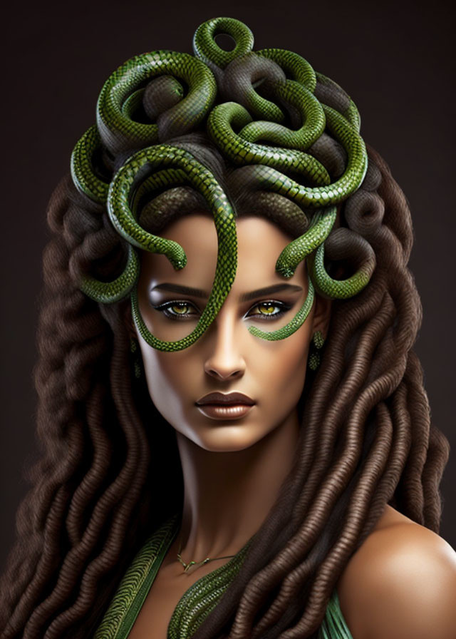 Woman with Medusa-inspired hairstyle and snake-themed makeup