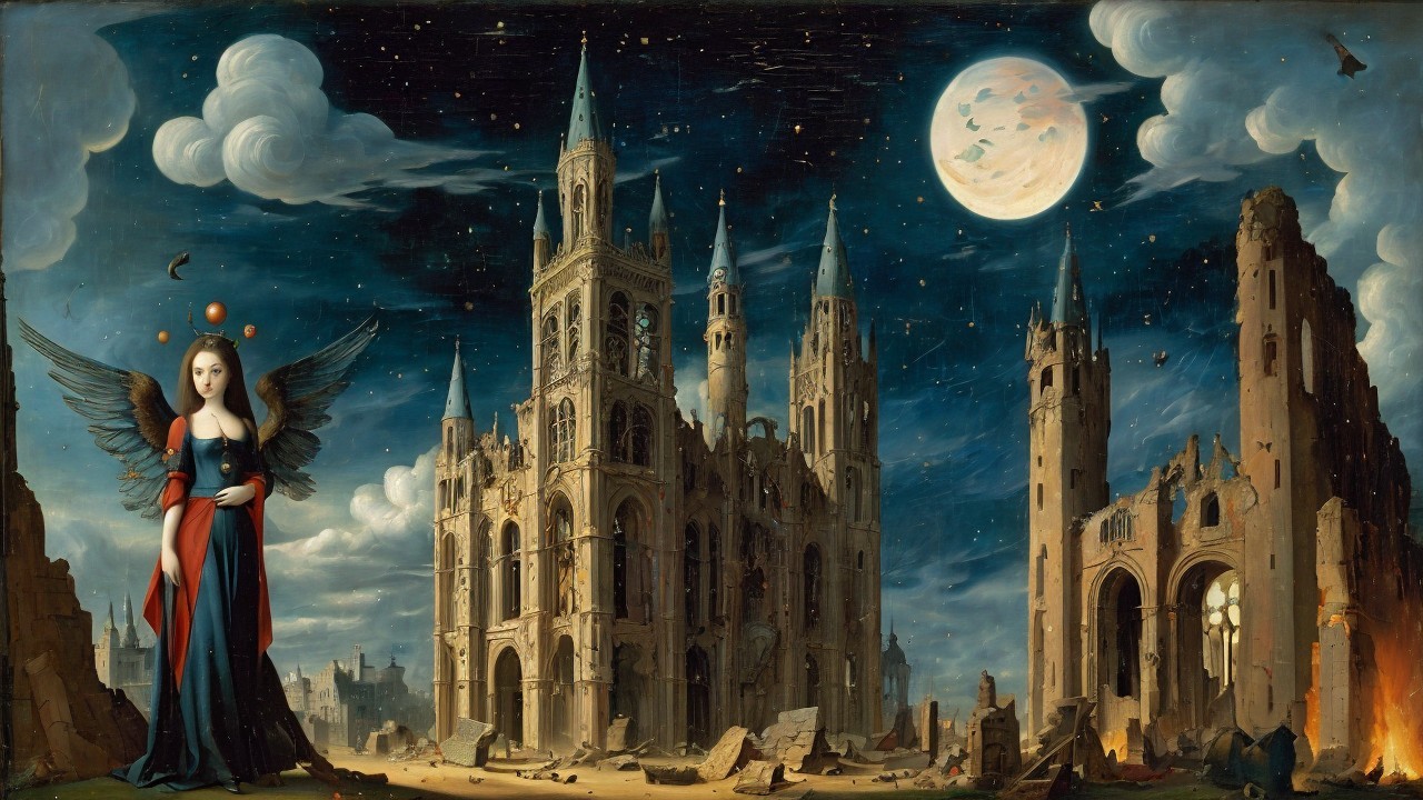 Prompt: "patchwork by Joan Miró, Hieronymus Bosch, Benjamin Lacombe, Brien Displain: beautiful female angel, standing spreading her wings, on the background of ancient ruins, under the moon. Byzantine face type, aesthetic gothic, surrealism, oil painting. Medieval Illuminated painting, Whimsical, spooky vibe, Dramatic: Storm, fire, destroyed buildings, Natural elements: Plants, animals, rocks, Abstract shapes: Lines, circles, extremely detailed, fantasy, intricate, beautiful, high detail, fantastic view, Unreal Engine, ornate, Oil Painting, Ink, green outline of canvas details, Whimsical lighting"