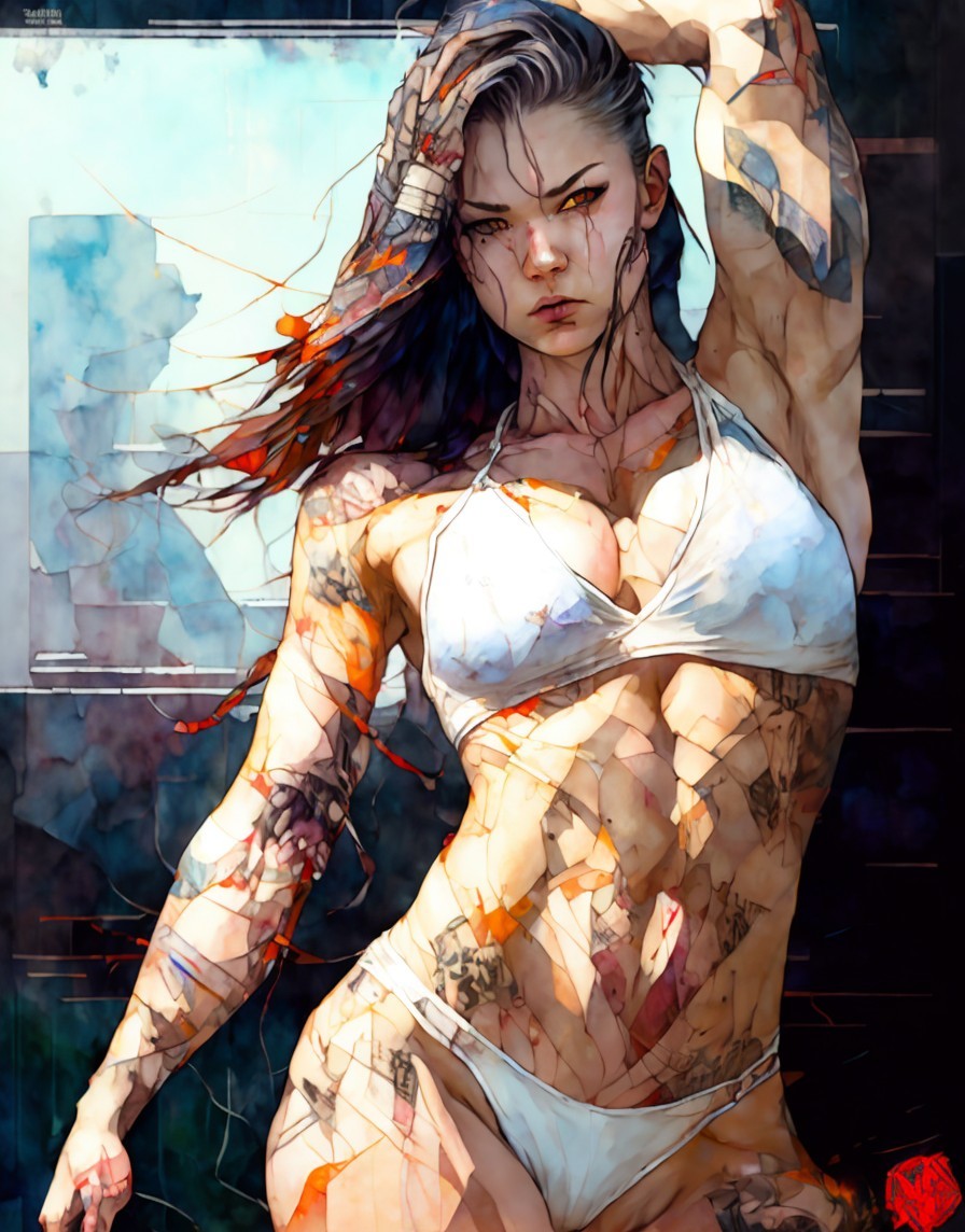 + Prompt:Patchwork portrait beautiful young woman sensual muscular tatoo in arms white small bikini in Style by Carne Griffiths,Tsutomu Nehei, Paul klee, artgerm, Picasso, Leonid afremov, Mondrian, Arthur Rackham, Enki Bilal. High definition, watercolor wet , beautifully lit, ethereal bleak mood