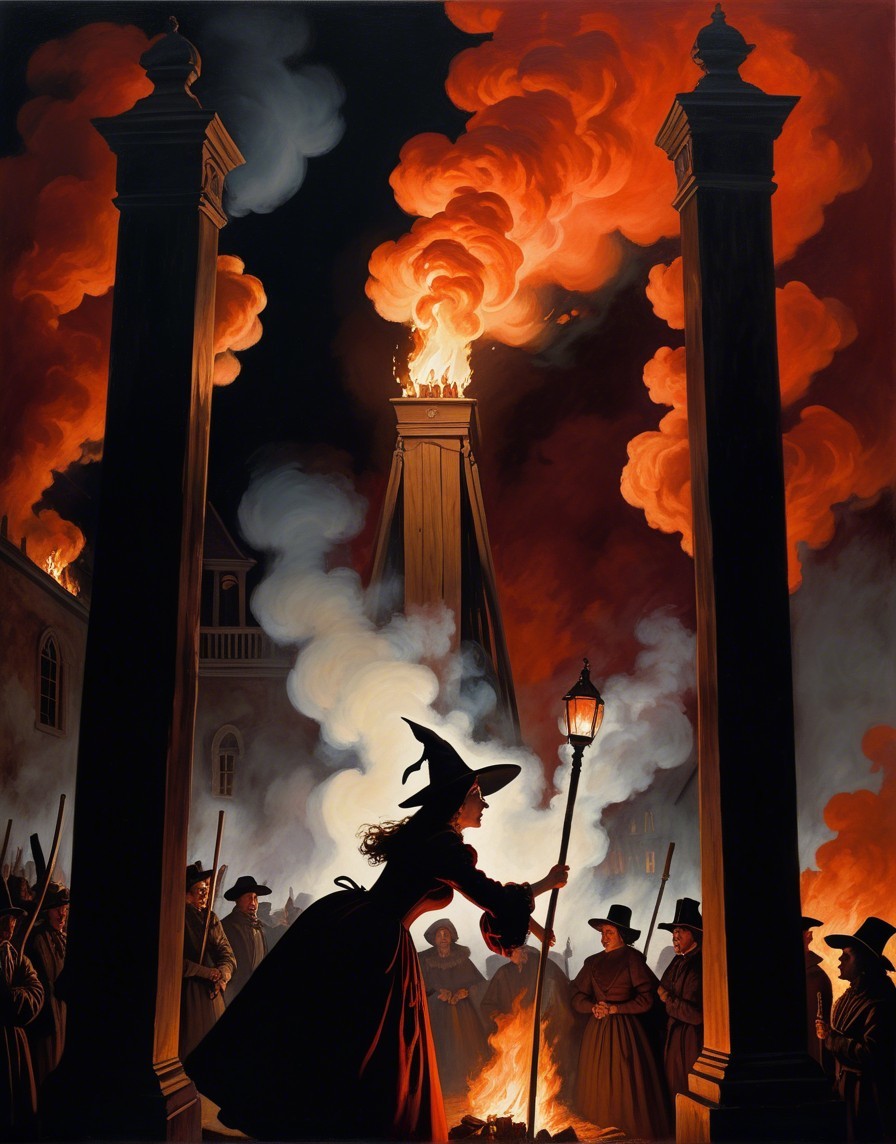 Prompt: Eerie witch trial scene, woman tied to wooden stake, flames engulfing her, dark, ominous atmosphere, 1600s setting, crowd of onlookers in period clothing, torch-lit environment, billowing smoke, haunting shadows, detailed facial expressions, historical accuracy in architecture and costumes, acrylic medium, high detail, rich color palette of deep reds, oranges, and blacks, dramatic lighting with flickering flames casting dynamic shadows, fantasy elements subtly incorporated, 16K resolution for intricate textures and sharp details, ambient occlusion for depth and realism, Artstation showcase.