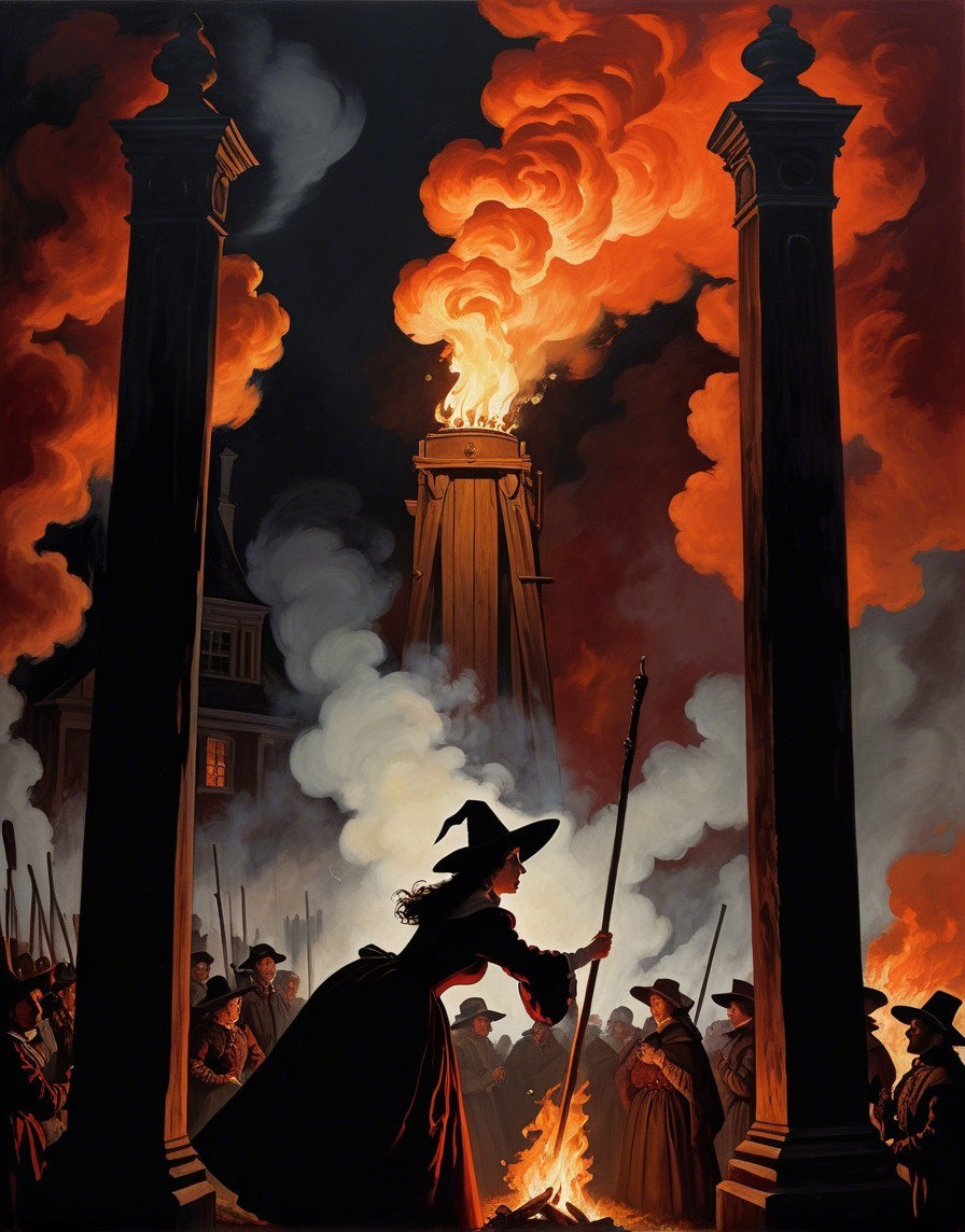 Eerie witch trial scene, woman tied to wooden stake, flames engulfing her, dark, ominous atmosphere, 1600s setting, crowd of onlookers in period clothing, torch-lit environment, billowing smoke, haunting shadows, detailed facial expressions, historical accuracy in architecture and costumes, acrylic medium, high detail, rich color palette of deep reds, oranges, and blacks, dramatic lighting with flickering flames casting dynamic shadows, fantasy elements subtly incorporated, 16K resolution for intricate textures and sharp details, ambient occlusion for depth and realism, Artstation showcase.