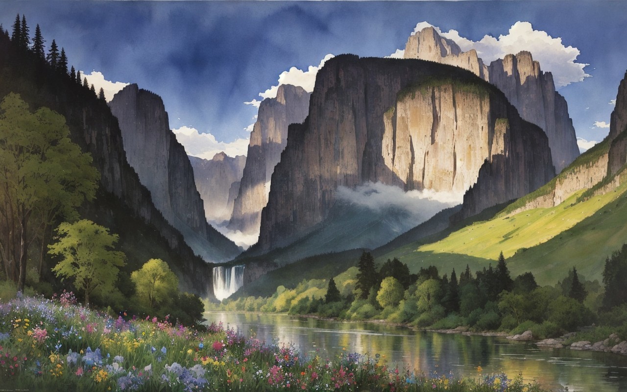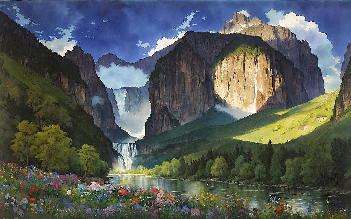 A serene landscape painting featuring majestic mountains, a waterfall, lush greenery, and a vibrant assortment of wildflowers by a calm river.