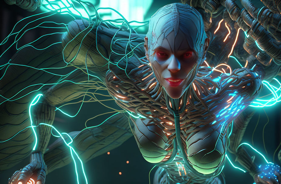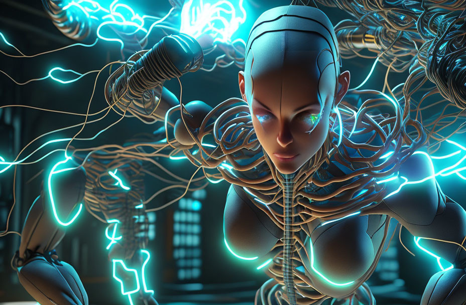 Glowing blue-eyed humanoid robot connected by cables in high-tech setting