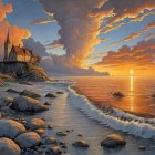 A serene autumn landscape featuring a flowing river surrounded by vibrant foliage in shades of orange and yellow. Rocky banks and colorful wildflowers create a tranquil, picturesque scene.