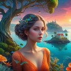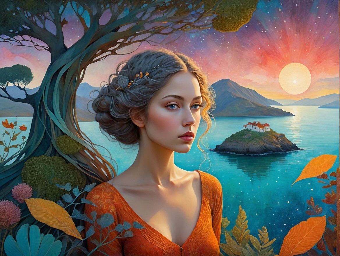 Ethereal female portrait, surreal and impossible perspective, intricate details, dreamlike atmosphere, magical elements, whimsical touches, vibrant color palette, intricate patterns, flowing hair, expressive eyes, fusion of realism and fantasy, Scott Bergey, Squeak Carnwath, Stasia Burrington influences, fine art quality, digital painting, high resolution, soft and diffused lighting, intricate textures, enchanting and thought-provoking, Artstation showcase.