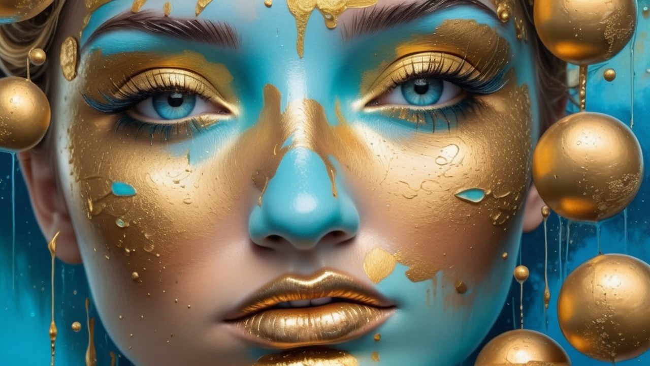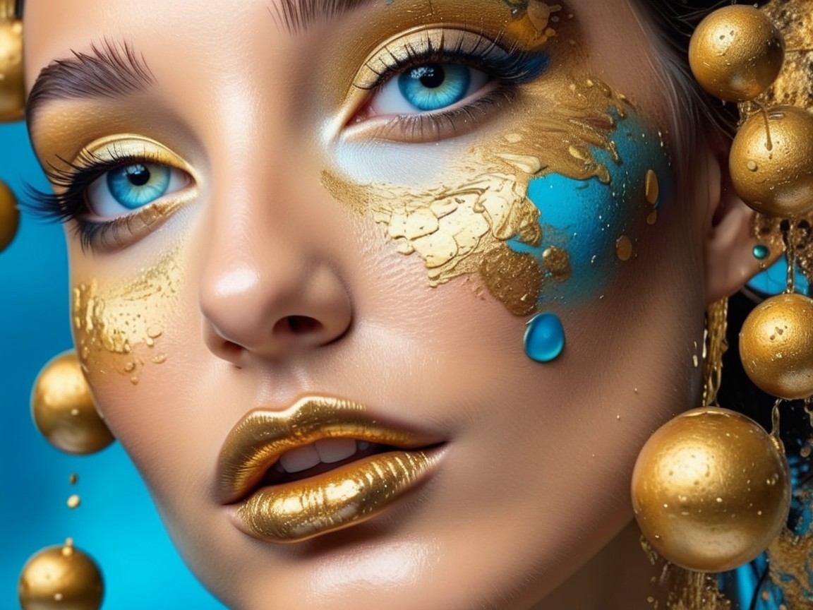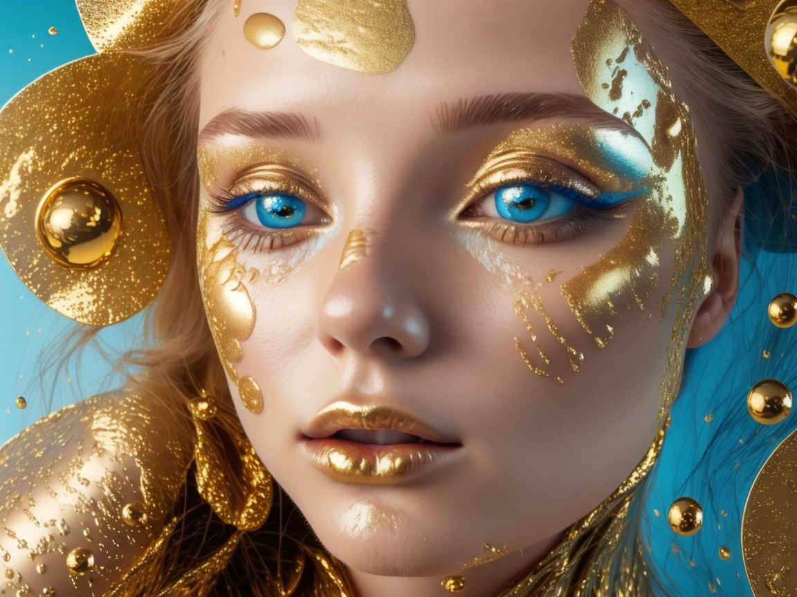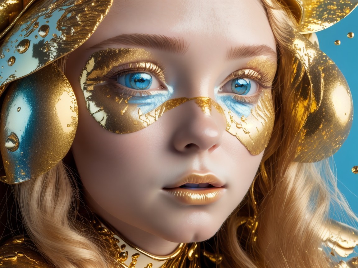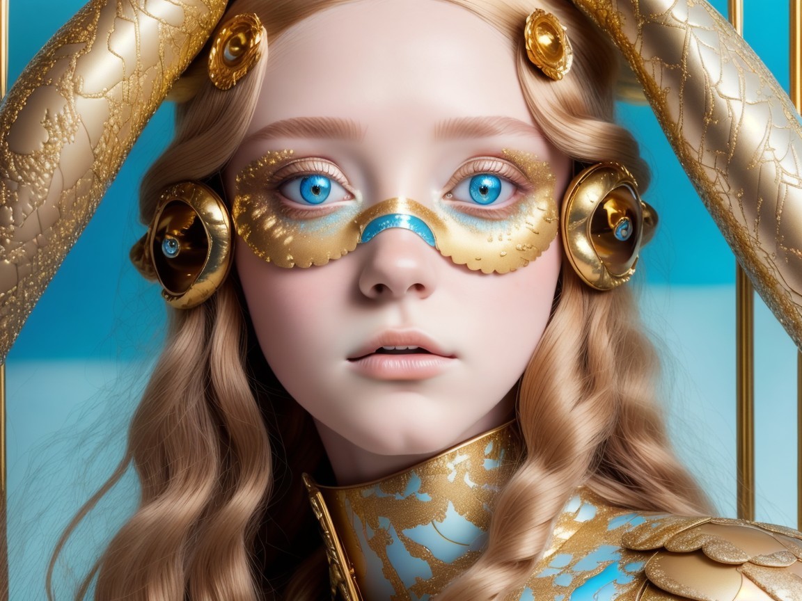 A close-up of a young woman with striking blue eyes, adorned in an intricate, golden headpiece and decorative sunglasses, set against a vibrant turquoise background. Her expression is serene and otherworldly.