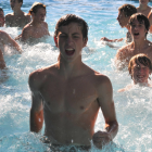 A young man with a confident demeanor sits against an abstract blue and white background, showcasing his casual grey t-shirt, while a guitar leans nearby, adding a musical touch to the scene.