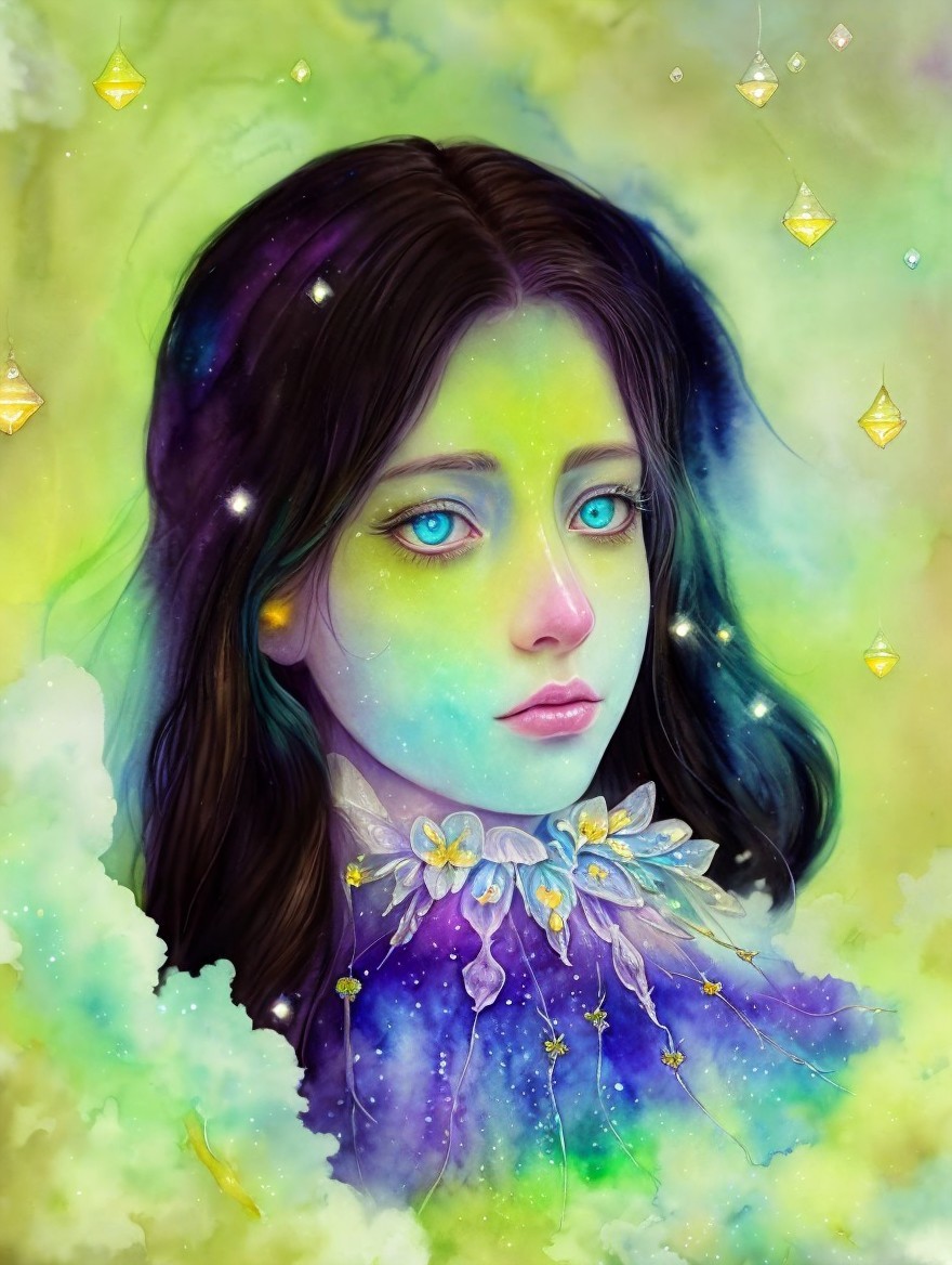 + Prompt:watercolor portrait, delicate fantasy goddess, small lines in shades of blue and yellow watercolor and gouache, Iridescent watercolor, extremely detailed glowing eyes, high definition, crisp quality, translucent candyfloss garments, yellow ultra detailed background with natural scenery, medieval fantasy , Violets, trees, silver bubbles, tints of surrealism, mythical brightness, gorgeous plasticity, slight sparks, highlighted reflections golden ratio, brightness on top,