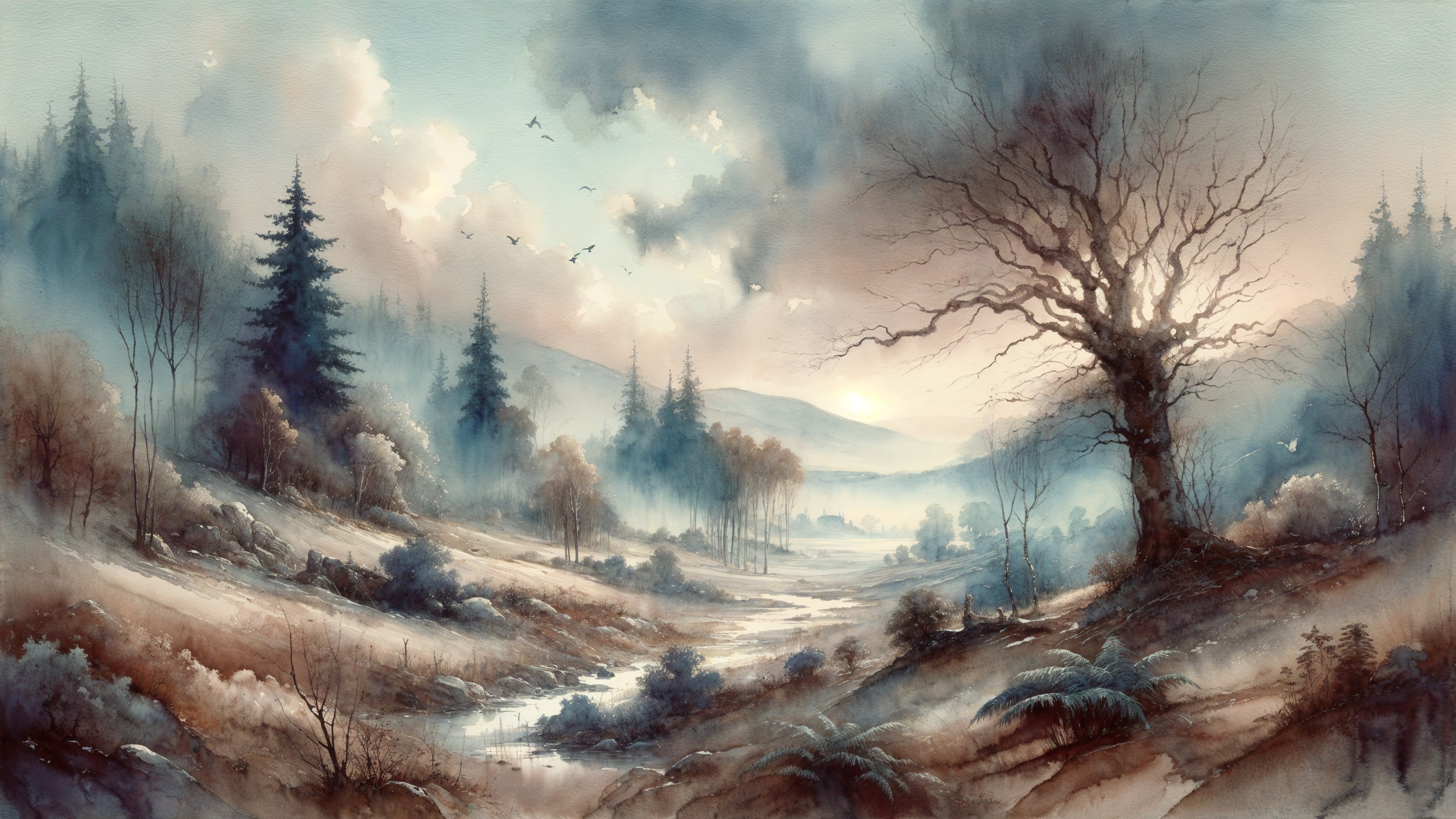 A serene landscape painting features a tranquil river winding through lush greenery. Trees line the banks, while vibrant pink flowers bloom nearby under a soft, hazy sky.