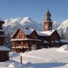 A charming winter landscape featuring two red houses with snow-covered roofs, surrounded by evergreen trees and majestic mountains in the background under a bright blue sky.