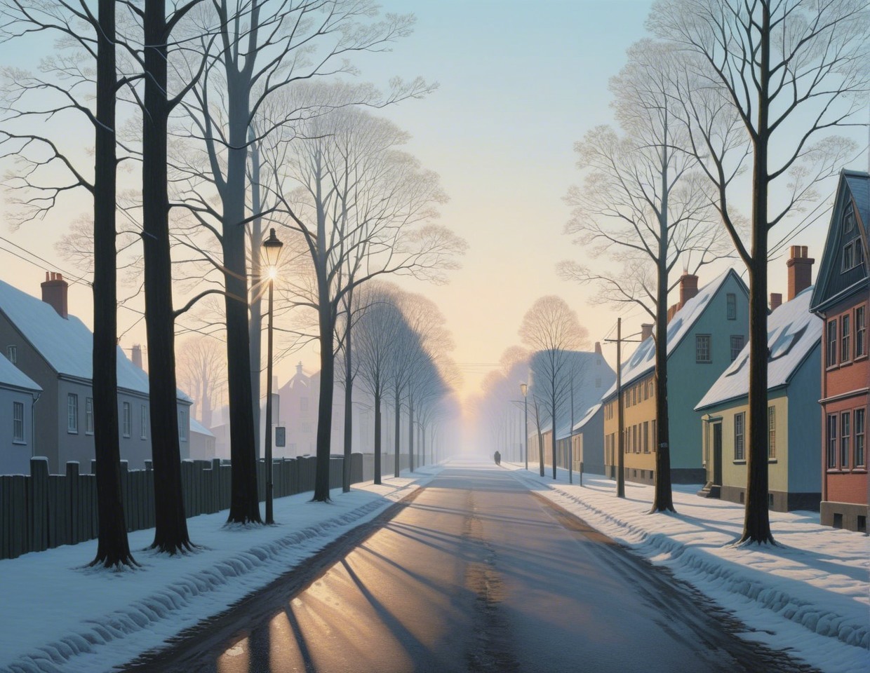 A tranquil winter scene depicts a snow-covered village with quaint houses lining a serene canal, framed by bare trees and a soft pastel sky at sunrise. The landscape exudes calm and beauty.