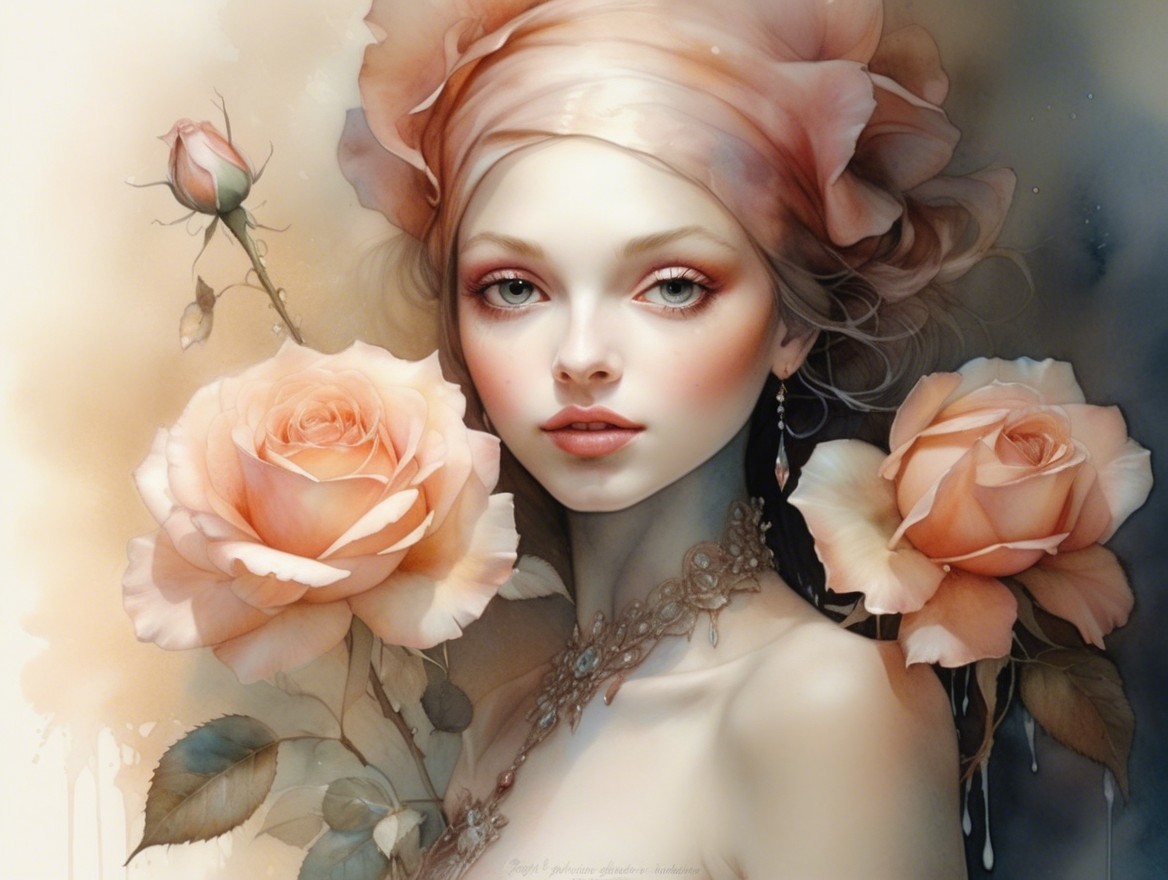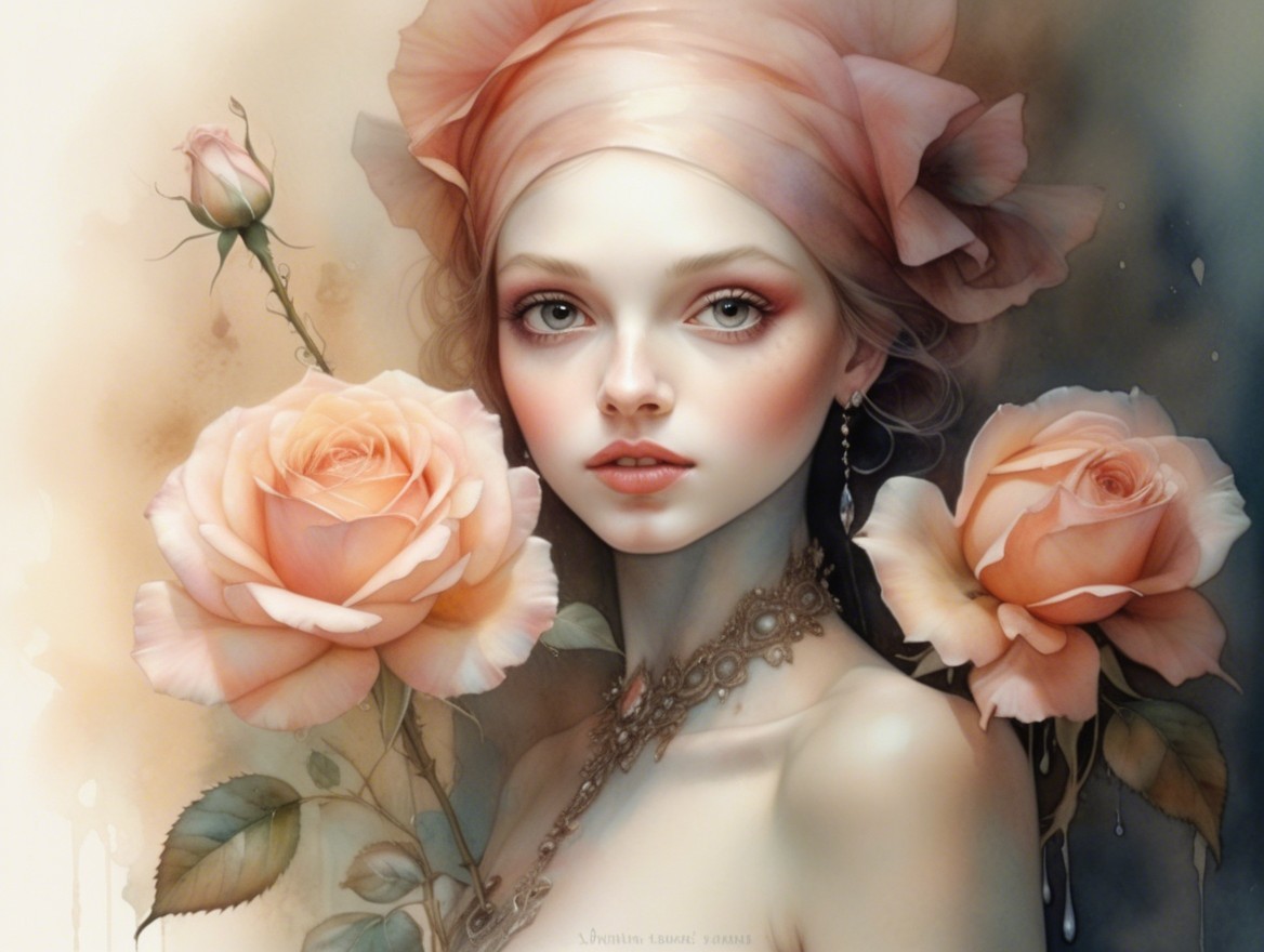 A serene portrait of a young woman adorned with pink roses, her soft features and delicate jewelry evoke a sense of beauty and grace, set against a gentle, abstract background.