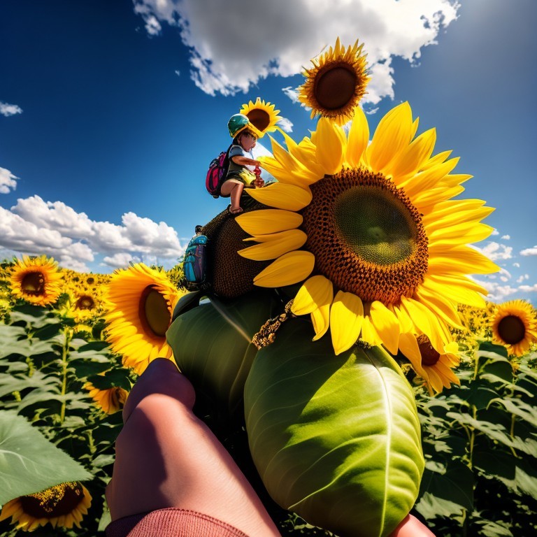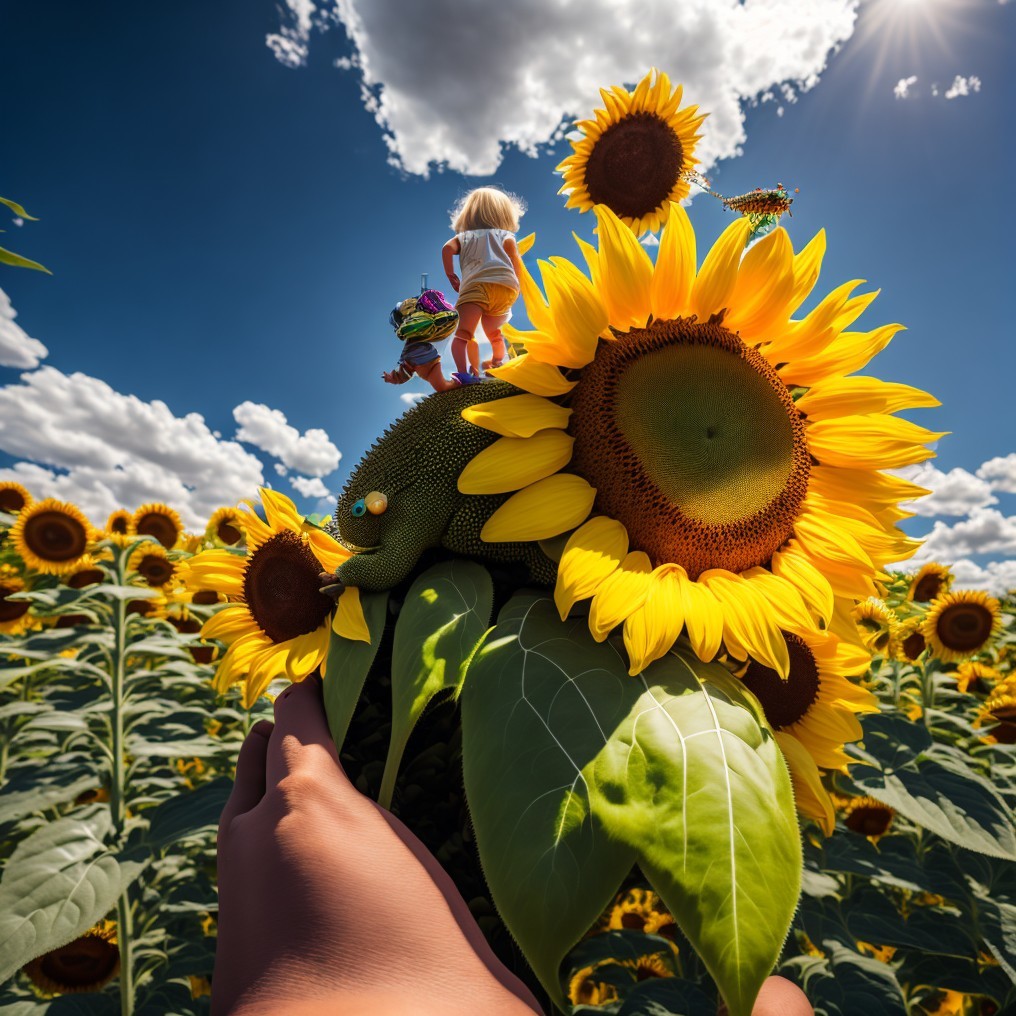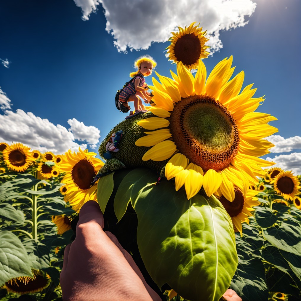 A child sits atop a sunflower towering above a field under a sunny sky, while a hand holds a doll mimicking the scene.
