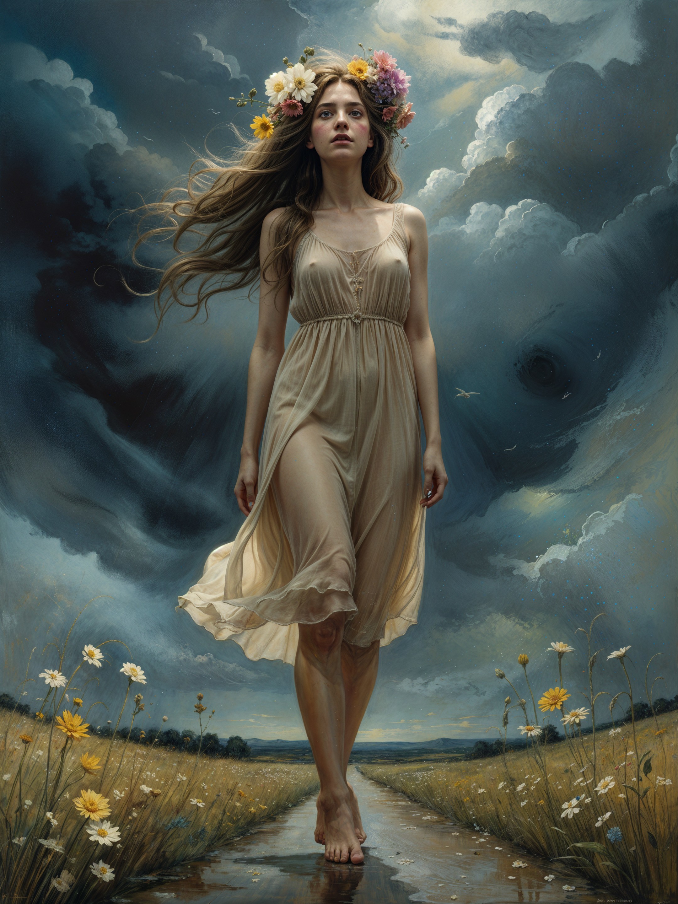 Prompt: She (beige dress, barefoot, flowers adorning her hair) lives in a world of her own. Surreal dark dreamscapes, stormy sky, fantastic creatures. Spectrum Magazine, Graphic Novel Comic Art by Bill Sienkiewicz, Francis Bacon, Marc Chagall, Ben Templesmith, Dave McKean, Brom: translucent, ethereal, digital painting, dof , extremely detailed, cinematic lighting, hyperrealistic, 4K, Art of Illusion 3D shading