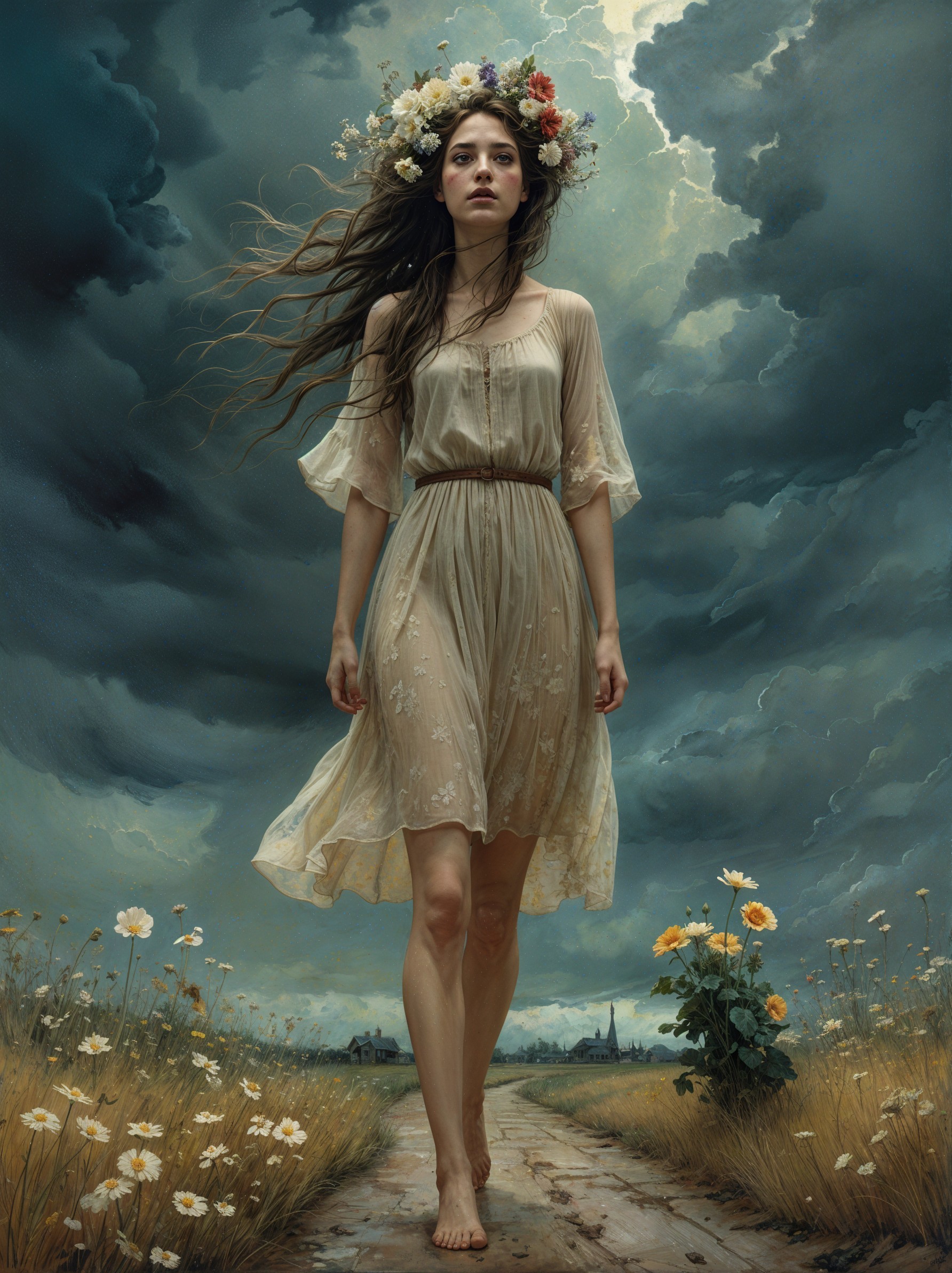 Prompt: "She (beige dress, barefoot, flowers adorning her hair) lives in a world of her own. Surreal dark dreamscapes, stormy sky, fantastic creatures. Spectrum Magazine, Graphic Novel Comic Art by Bill Sienkiewicz, Francis Bacon, Marc Chagall, Ben Templesmith, Dave McKean, Brom: translucent, ethereal, digital painting, dof , extremely detailed, cinematic lighting, hyperrealistic, 4K, Art of Illusion 3D shading"