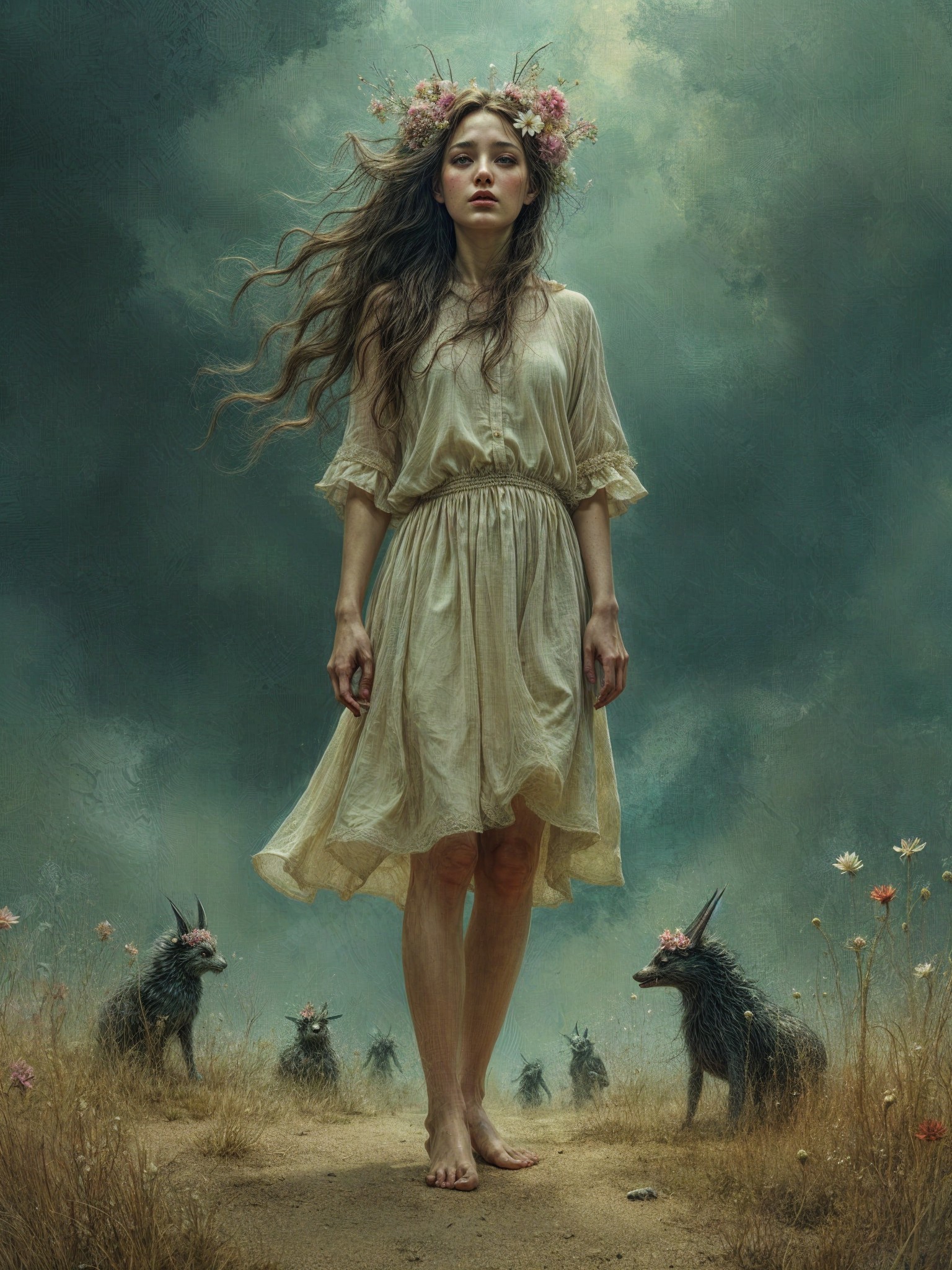She (beige dress, barefoot, flowers adorning her hair) lives in a world of her own. Surreal dark dreamscapes, stormy sky, fantastic creatures. Spectrum Magazine, Graphic Novel Comic Art by Bill Sienkiewicz, Francis Bacon, Marc Chagall, Ben Templesmith, Dave McKean, Brom: translucent, ethereal, digital painting, dof , extremely detailed, cinematic lighting, hyperrealistic, 4K, Art of Illusion 3D shading
