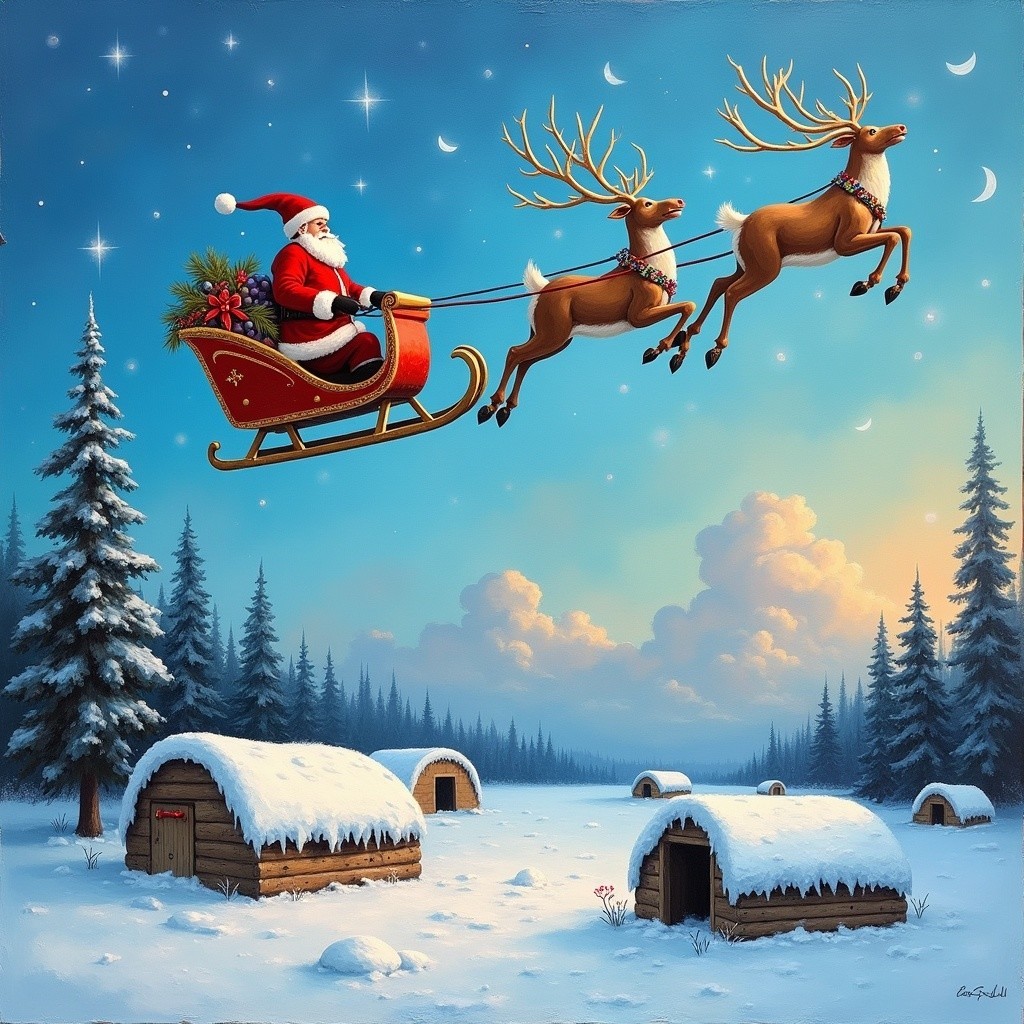 Santa Claus in a sleigh, soaring through a starry night sky with just two reindeer.