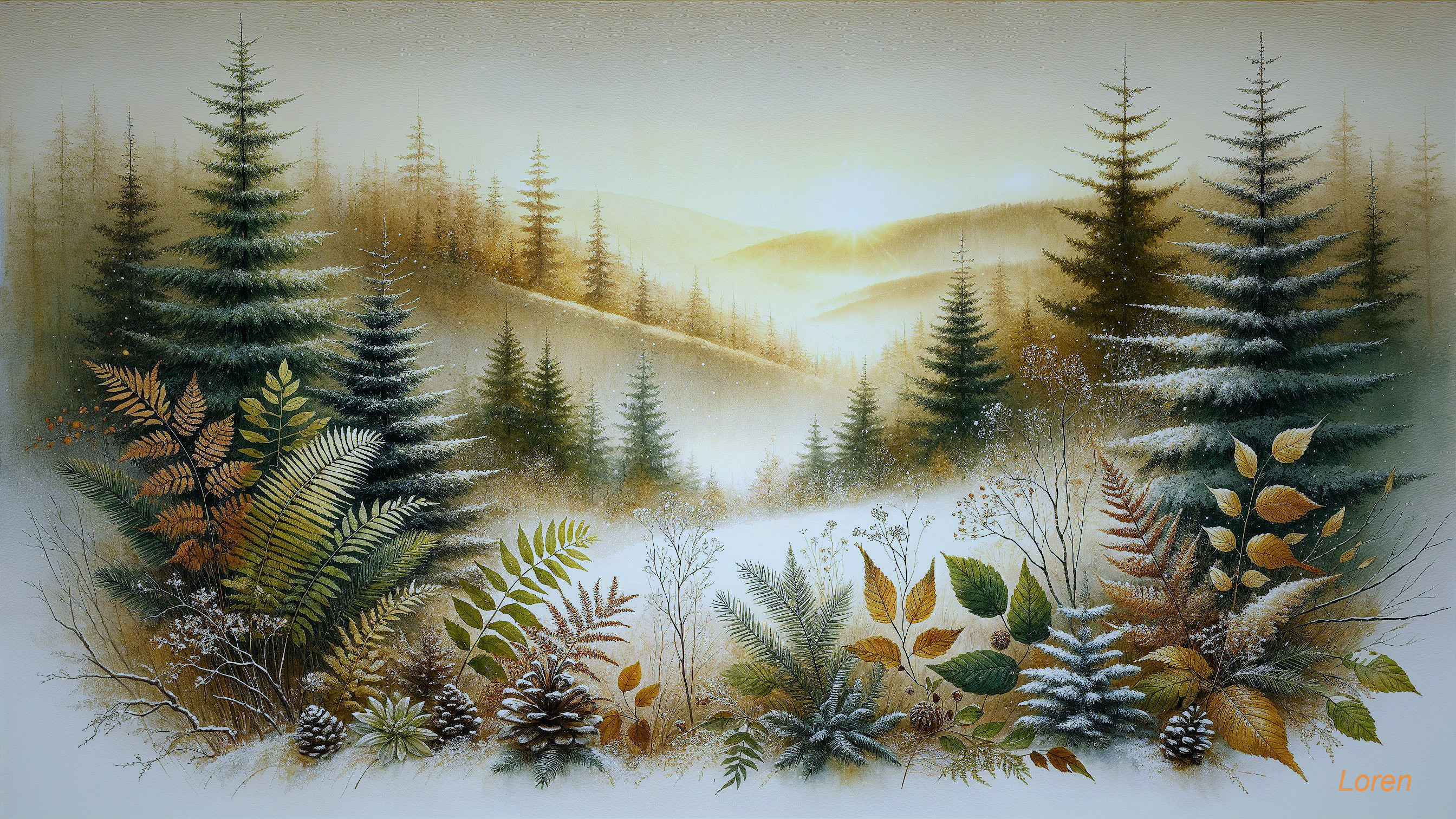 The image depicts a serene winter landscape with evergreen trees, gently rolling hills, and soft sunlight. In the foreground, varied foliage, including ferns and pine cones, adds vibrant color.