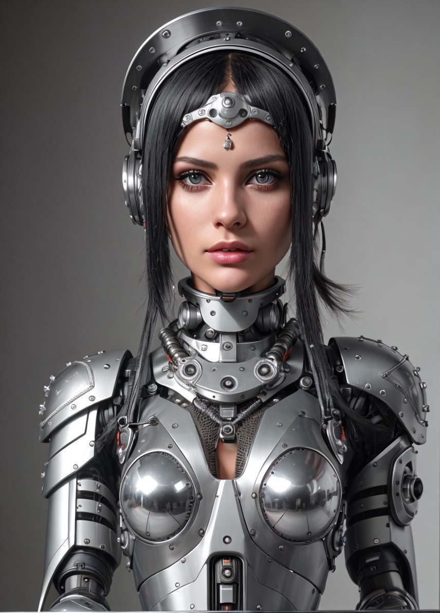 A hyper-realistic female robot with a futuristic headset and metallic armor, featuring human-like eyes and black hair.