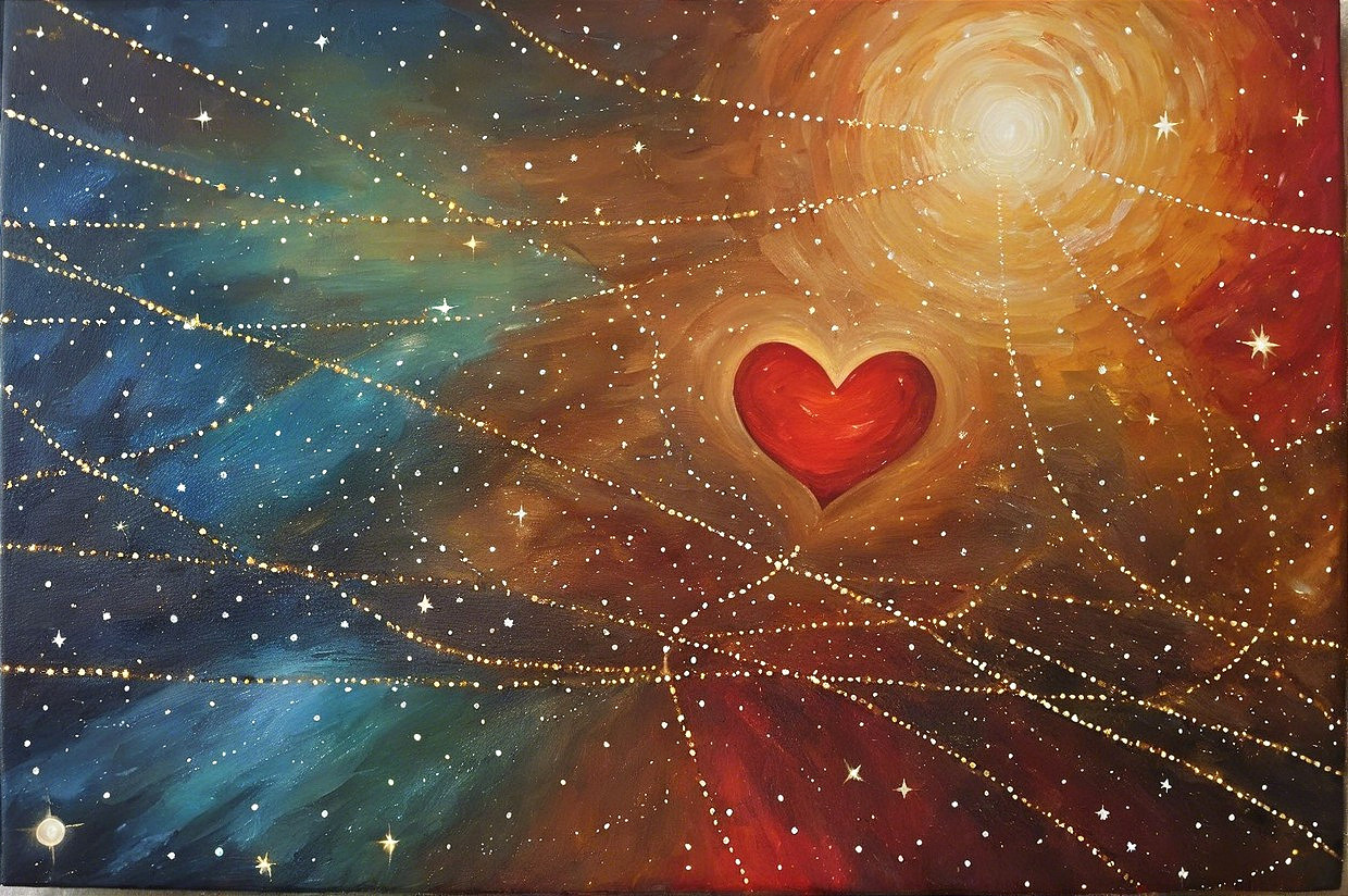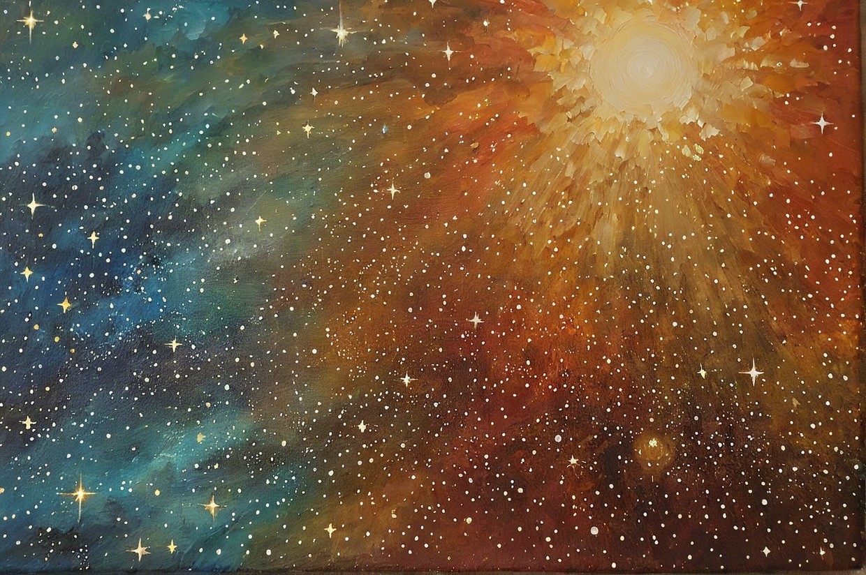 A silhouette of a person stands on a shore, gazing at a vibrant sky divided between a bright orange sun and a cool blue moon, stars twinkling amidst a rich, colorful landscape.