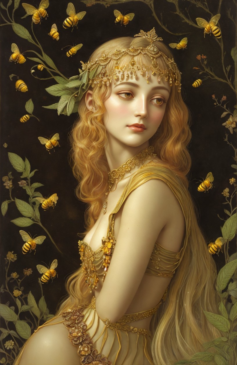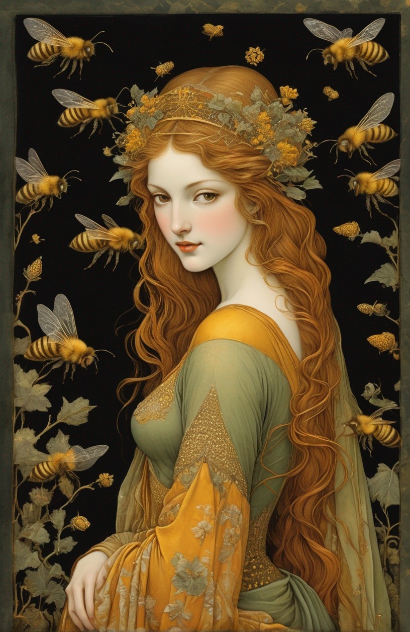 Woman with Wavy Hair Surrounded by Bees and Foliage