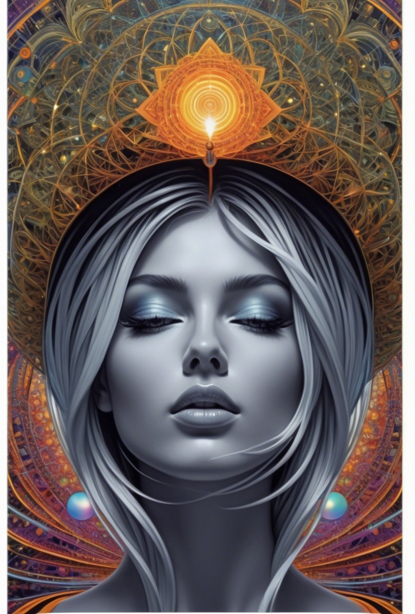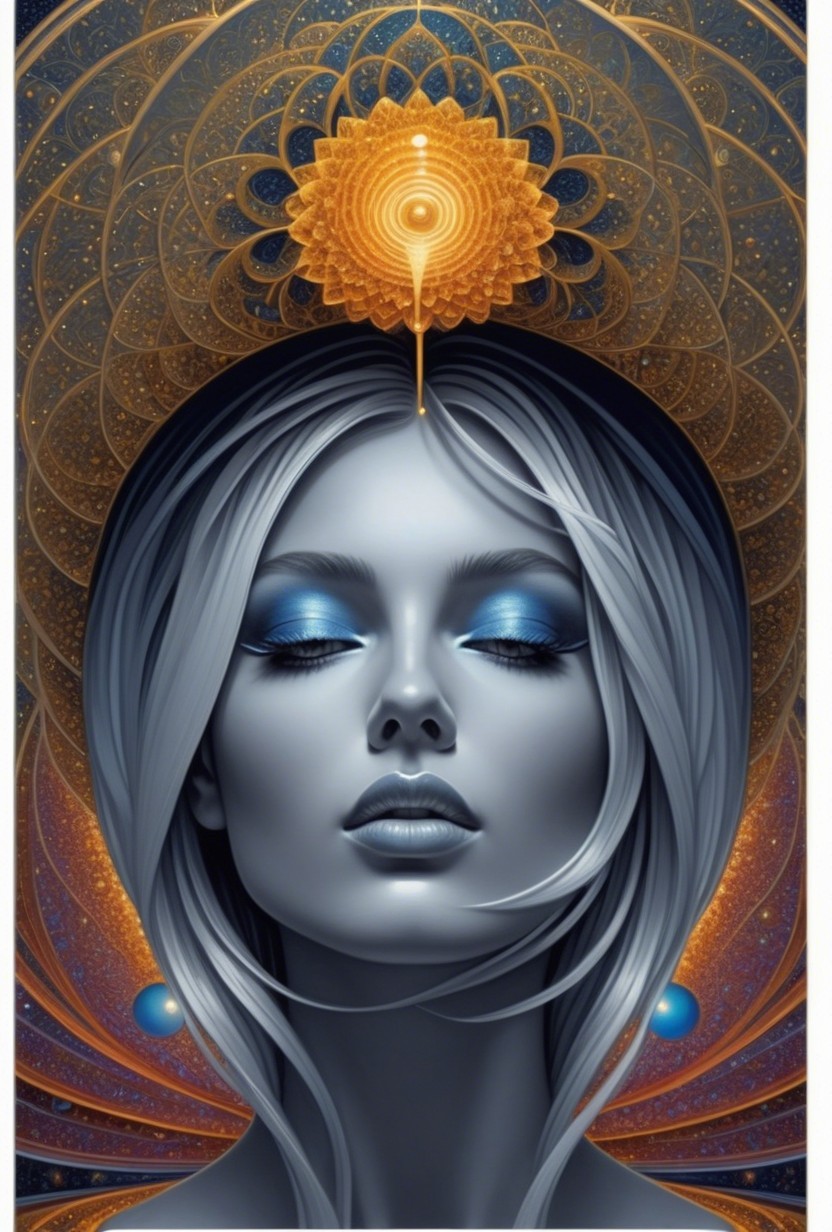 Vibrant surreal line-art, stylized portrait, blowball motif, geometrical intricate linework, swirls, cymatics, surrounded by flares, vibrant color palette, fantastical elements, surreal and dreamlike, catenaries, organic forms, micro-pen lineage, line-art detailing, stippling, push processing technique, post-avantgarde style, fine-line illustration, natural color gradient inking, raytraced shadows, 3D effects, plasticity 1.3, subsurface scattering 1.6, pointillism theme, Ho Baron inspired, overflowing with visual density, trippy, warm-toned, very colorful, large-scale complexity, angled, colorful and detailed, surreal sketchbook art, tesselated, micro-level intricacy, plasticity 1.3, flecks, dots, rounded edges, pointilism theme, triadic color scheme metallic-honey deep-blue light-beige, line-art by William Bradley, hues by Ho Baron and Ed Binkley, blurred, rim lighting, smeary, surreal aesthetics by Ray Donley, interwoven textures, voluminous collagraphy print, reminiscent of Man Ray's style, coloring by Gerald Brom. 128K HDR, avant-garde artwork, strikingly colorful, brightness 1.3, zentangle, plasticity 1.1, emulsion shifts, dyed, trippy, warm toned, ethereal glow, reminiscent of comic book art, vibrant, magical atmosphere, linocut contourings, surreal, dreamlike setting, intricate linework, octane render, digital painting. Rule of thirds, divisionism, radiance, balanced lighting.