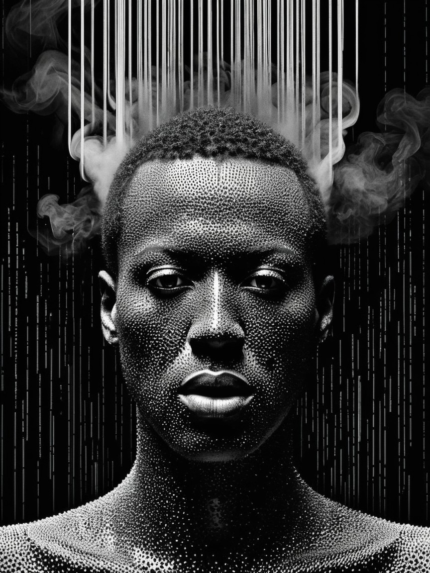 Prompt: "All in one art: "Toynyism_avant art ecstatic-orgasmic state of smoke pointillism blend seamlessly into a very judgy beautiful anthropomorphically morphed Barcode Generator GLITCH_CORE like the 'Steve Cutts art art Alfonso Font !! ?? !! inspired by Wifredo Lam Diaphanous art also by Huang Yongyu (1924-2023) Absurdly Brilliant Transformations'::abstract::vector art::Sensual H.R. Giger, anthropomorphically morphed like the refreshes the hybrid floats amidst an abstract, surrealist dreamscape by Catrin Welz-Stein and William Congdon, four-eyed beautiful female face, Red Poppies and Queen Anne’s Lace and Daisies and Dandelions, translucent bronze with patina skin, metalic and brass colours of skin, old green copper biomorphic details, anatomical,ultra detailed, Rubik cube like maze texture on body, Cel shading, Enki Bilal, Hana Yata, Alex Katz, high dynamic range image processing!""