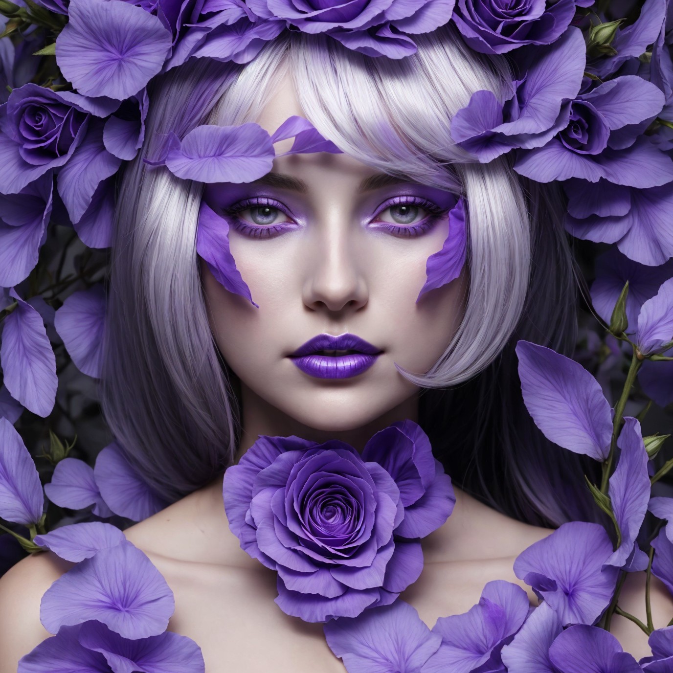 A woman with purple hair and makeup surrounded by purple flowers, creating a harmonious, floral aesthetic.