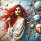A striking portrait of a woman with vibrant red hair cascading around her. Colorful splashes of paint create a dynamic backdrop, enhancing her bold makeup and expressive features.