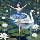 A graceful ballerina in a blue tutu adorned with flowers dances on a lily pad amid serene waters, accompanied by a majestic swan and blooming water lilies in a tranquil setting.
