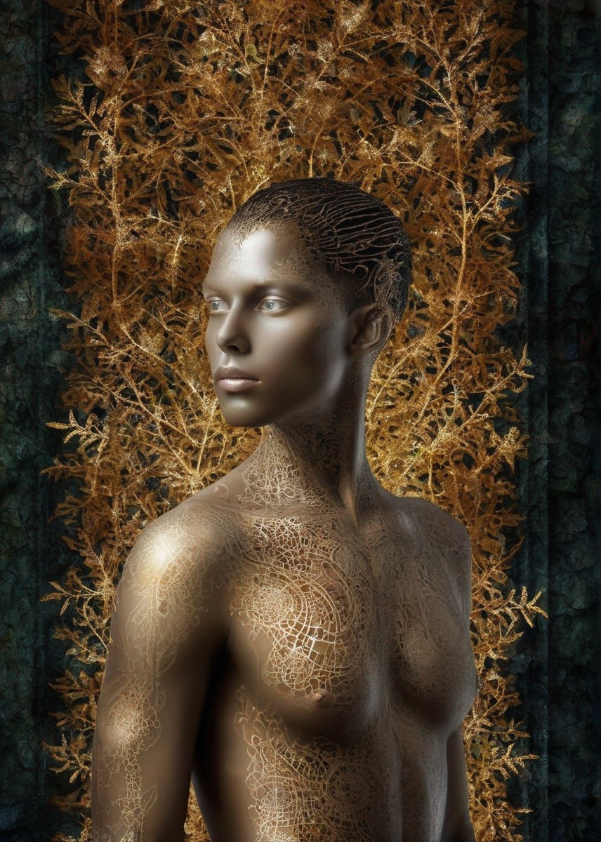 A person with intricate metallic face detailing and a headdress made of autumn leaves, meshing nature with a mystical aura.
