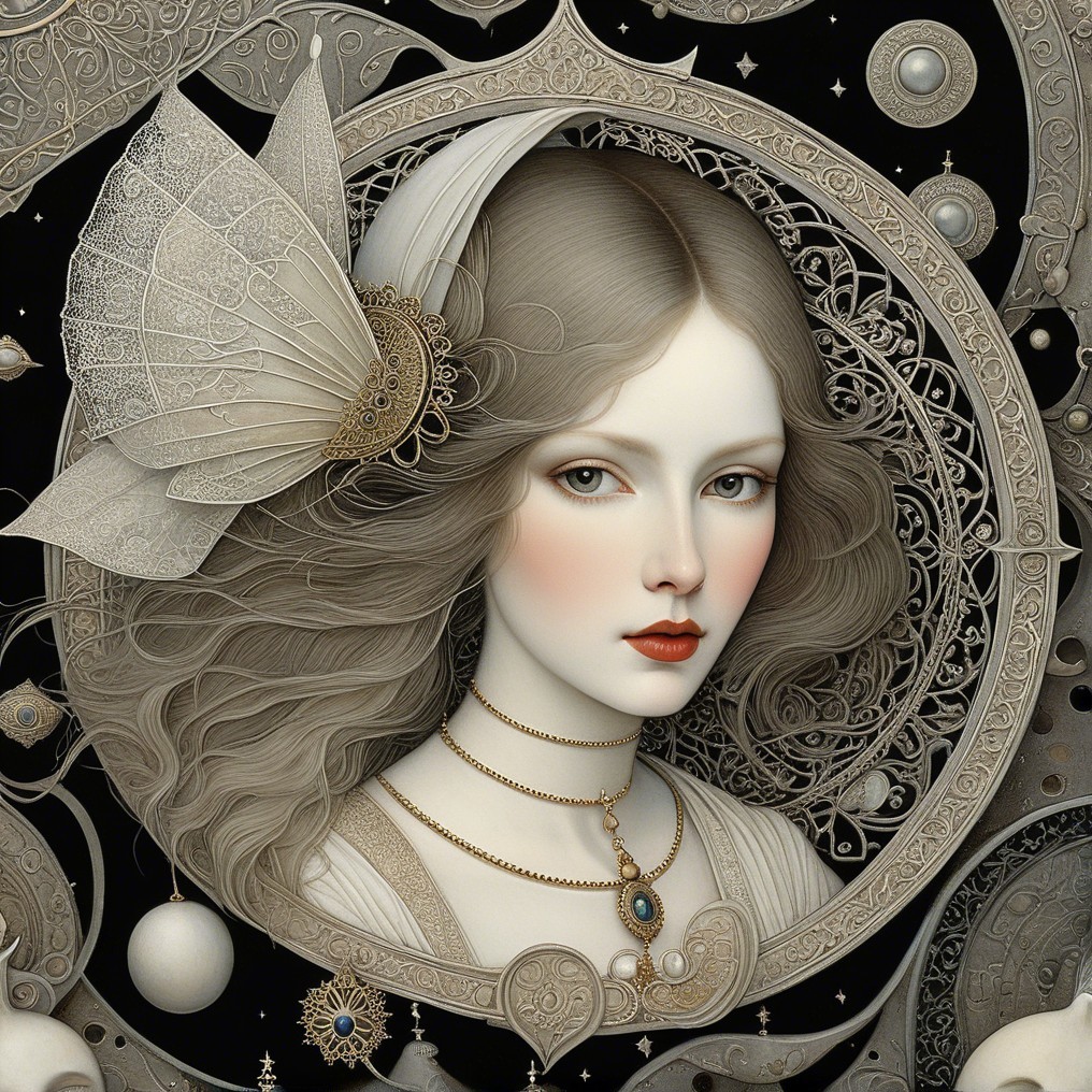 The image features a striking woman with elaborate dark hair adorned with large feathers and floral accents. She gazes softly, framed by ornate patterns in rich blue and gold tones.