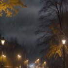 A serene night scene features bare trees with golden leaves lining a quiet street. Soft snowflakes fall, illuminated by warm streetlights, creating a magical winter atmosphere.