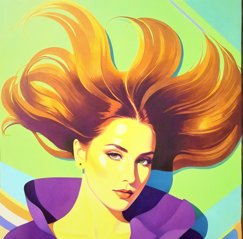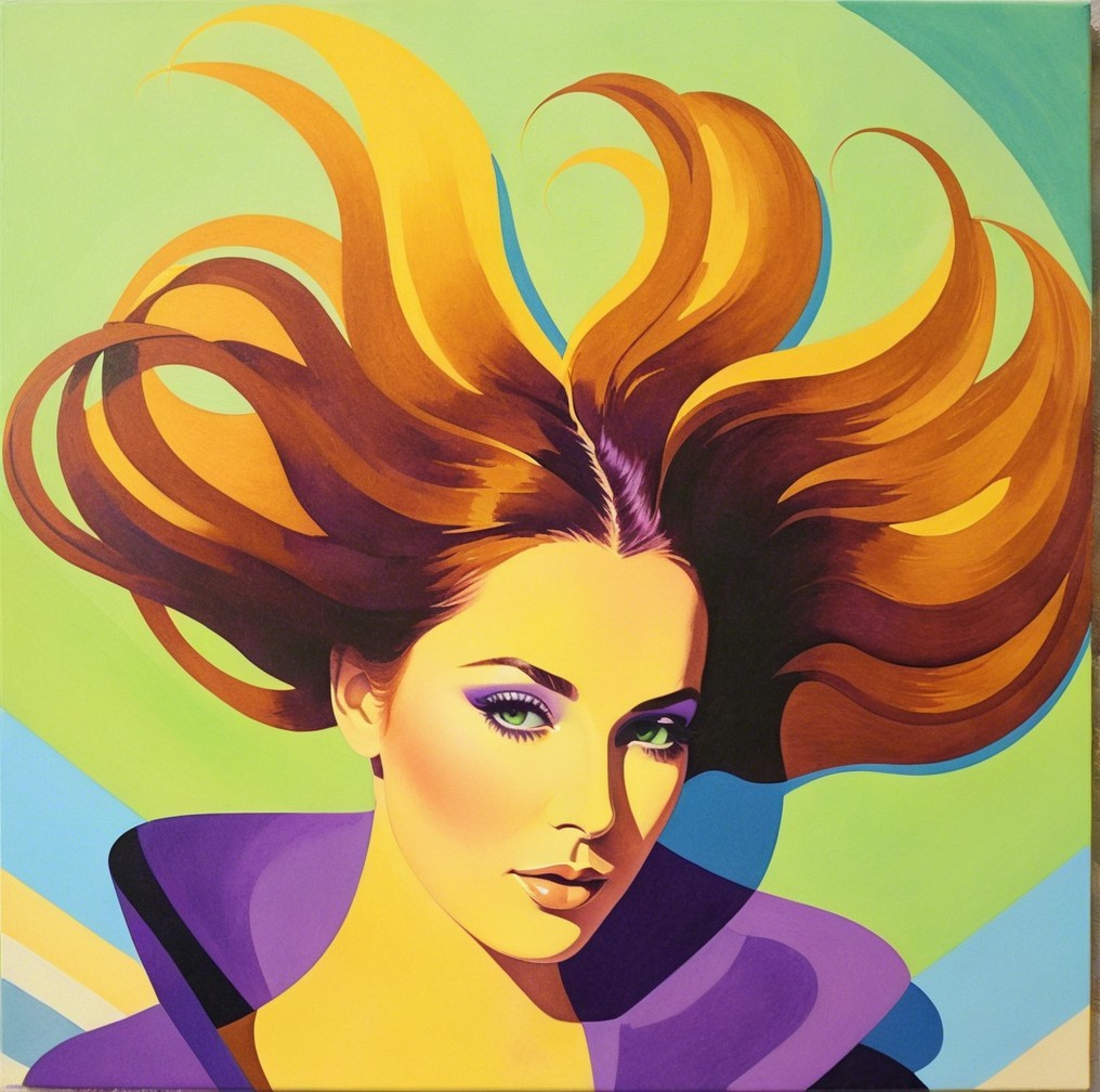 The image features a vibrant, stylized portrait of a woman with flowing hair. Her striking expression and colorful background create a dynamic, eye-catching effect.