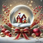 A festive snow globe featuring a charming stone cottage adorned with a wreath, surrounded by snow-covered trees. A cheerful snowman sits in the foreground, with gentle snowfall adding to the magic.
